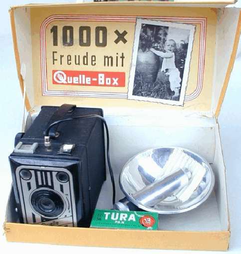 Boxkamera für den Rollfilm 120 (Aufnahmeformat 6 x 9 cm), ab 1950 im Angebot von Quelle, Fürth in Bayern. Objektiv: Meniskuslinse; zwei Brillantsucher (für Hoch- und Querformataufnahmen); Einfachverschluss (Z und M); Blitzsynchronanschluss, Zubehörschuh, Metallgehäuse mit Handgriff. Damals hatte Quelle noch keinen eigenen Foto-Quelle-Katalog und firmierte noch nicht unter der Hausmarke Revue.