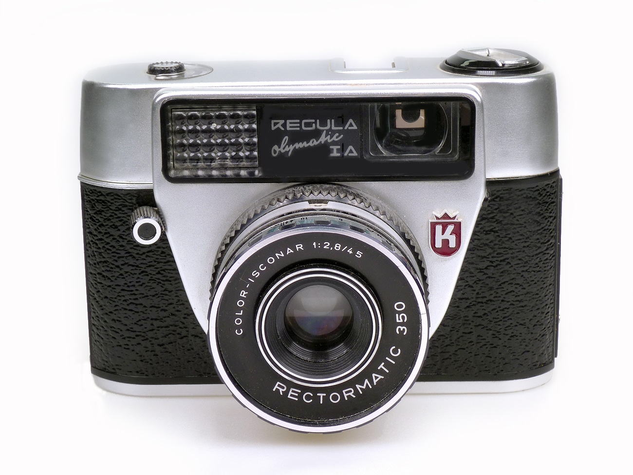 Sucherkamera für den Kleinbildfilm 135 (Aufnahmeformat 24 x 36 mm) aus dem Regula Werk King KG, Bad Liebenzell, hergestellt ab 1966. Manuelle Scharfstellung, Integralmessung, manuelle Belichtungssteuerung oder Programmautomatik. Aus dem damaligen Prospekt: „Die neue Regula Olymatic I A … dürfte die erste Kamera mit programmgesteuerter Belichtungsautomatik sein, bei der die jeweils gewählte Zeit-Blenden-Kombination (in einem kleinen Fenster auf der Kameraoberseite) abgelesen werden kann. Realisierbar wurde diese Kontrollmöglichkeit durch Verwendung des Blendenverschlusses Rectormatic-350 (mit Zeiten von 1/30 bis 1/350 Sekunde sowie B-Einstellung). Der automatische Belichtungsmechanismus kann – um Nah-Messwerte „festzuhalten“ – gesperrt oder bei Bedarf völlig abgeschaltet werden. Im übrigen ist das Messwerk auf Filmempfindlichkeiten von 12 bis 27 DIN einstellbar. Für die optische Ausstattung wurde ein Color-Isconar 1:2,8/45 mm und ein zweiachsiger Leuchtrahmensucher verwendet. Weitere Merkmale der Olymatic IA sind: umschaltbarer Mittenkontakt im Zubehörschuh; Schnellschalthebel; Rückspulkurbel und Zählwerk mit automatischer Nullstellung.“
