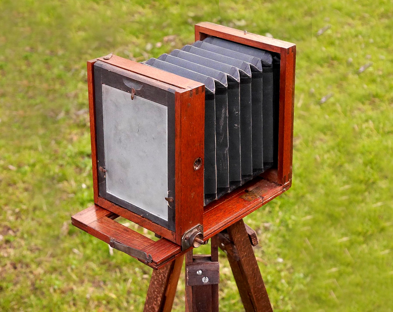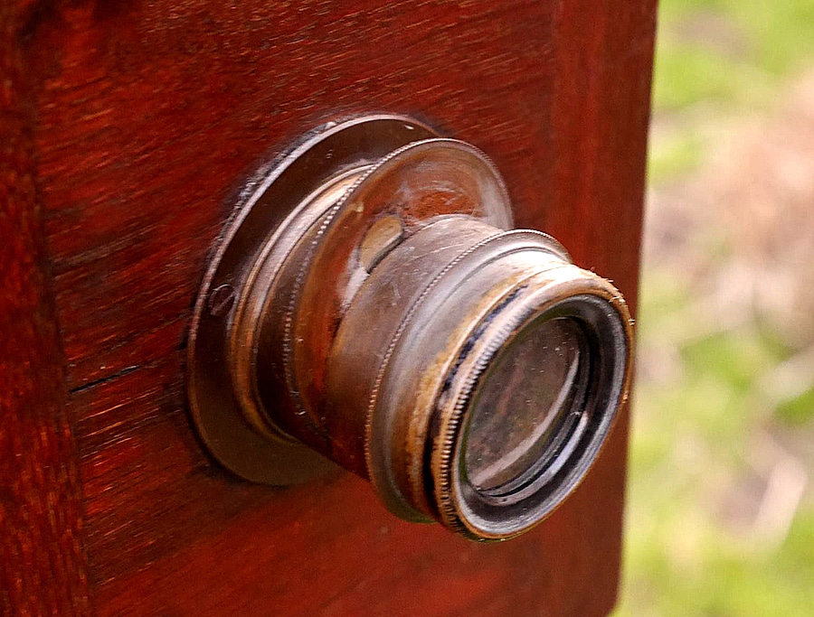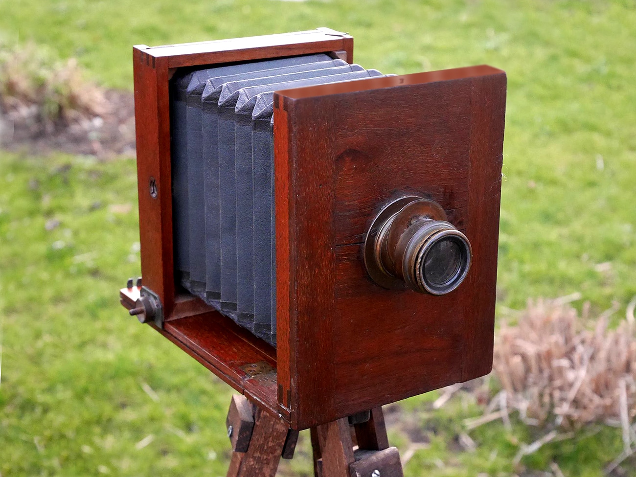 Schnuckelige, kleine Holzkamera eines unbekannten Herstellers, vermutlich so um 1900. Unbenannter Zweilinser im Messing-Tubus (Linsendurchmesser zirka 22 mm) mit Steckblenden. Für Kassetten im Format 9 x 12 cm. Beschläge aus Messing und gestanztem Blech. Abmessungen Korpus (Breite x Höhe x Tiefe) 13 x 17,5 x 22,5 cm. Balgen aus schwarzem Karton. Zwei eingelassene Stativgewinde für Hochformat- und Querformataufnahmen.
