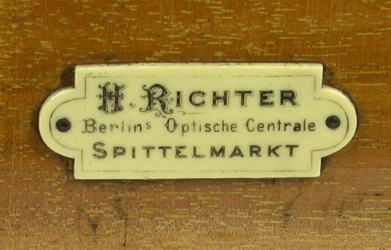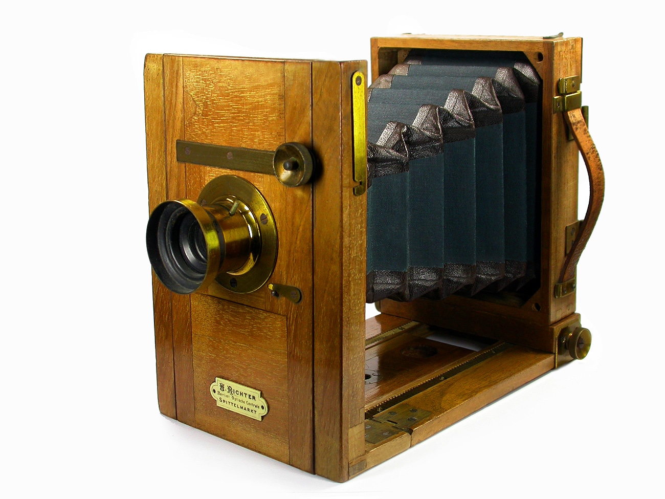 Unbezeichnete handliche Reisekamera (Ende des 19. Jahrhunderts) für das Format 9 x 12 cm im Vertrieb H. Richter, Berlin. Blauer Stoffbalgen mit Lederecken. Die hintere Standarte kann mittels der an ihrem unteren Rand angeordneten Rändelschraube zum Fokussieren horizontal bewegt werden; in der vordersten Position lässt sich die Bodenplatte nach oben in Transportstellung klappen. Vertikal verstellbare Objektivstandarte mit ungemarktem Messingobjektiv „Rapid-Aplanat No. 1“.  Am Objektiv oben erkennbar der Blendenhebel. Der Name „Aplanat“ steht für eine Objektivbauart, bei der zwei Linsengruppen symmetrisch, mit der Blende in der Mitte, angeordnet sind und wurde von verschiedenen Herstellern z. B. Emil Busch, Rathenow oder Goerz verwendet.