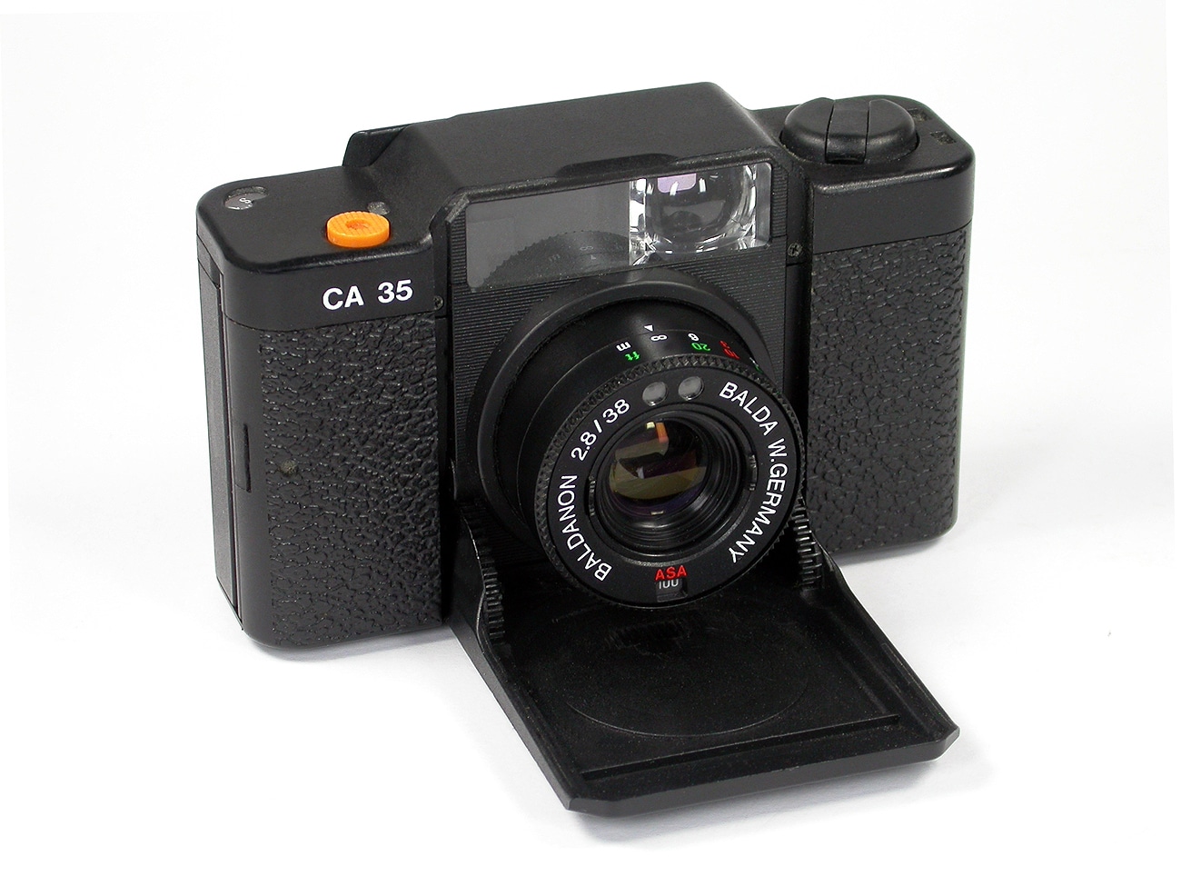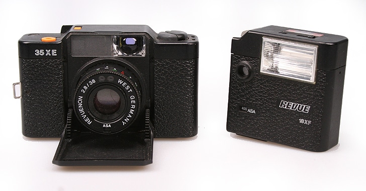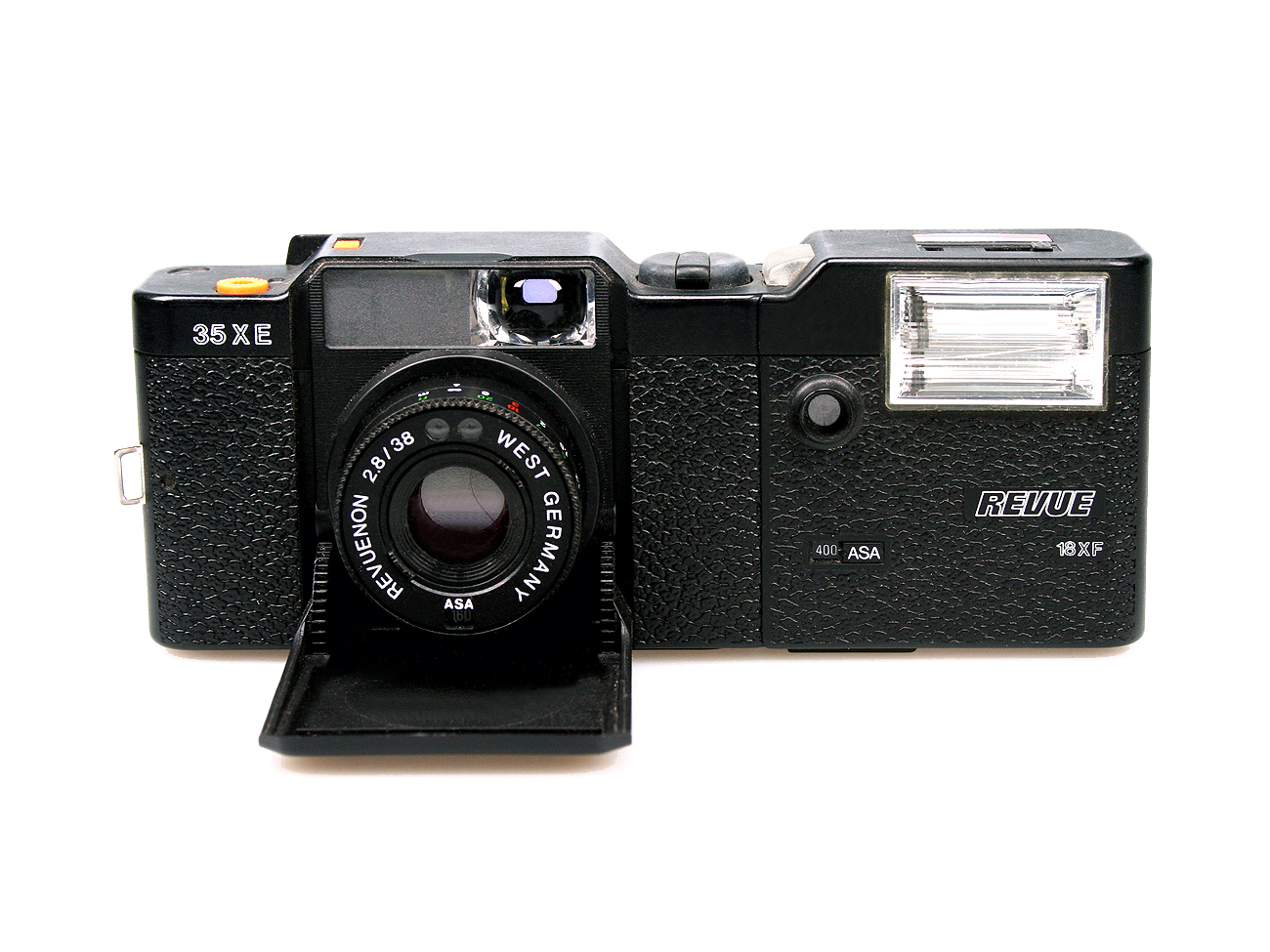 Sucherkamera, hergestellt in Westdeutschland ab 1985 für den Kleinbildfilm 135 (Aufnahmeformat 24 x 36 mm), mit versenkbarem Objektiv, hier zusätzlich mit dem dazugehörigen Elektronen-Blitz Revue 18 XF. Objektiv: Revuenon 1:2,8/38 mm (4 Linsen/3 Glieder), manuelle Scharfstellung, elektronischer Zentralverschluss bis 1/500 Sekunde, Integralmessung, Programmautomatik. Ausstattung: Schutzklappe für Objektiv, Messzellen und Sucher; Wechsel-Funktionsanzeige, Auslösesperre, Drahtauslöseranschluss, Trageschlaufe, Stativgewinde 1/4 Zoll. Belichtungsautomatik mit 2 CdS-Zellen. Sucher: Leuchtrahmensucher 0,5 x mit Parallaxemarken, Symbolanzeige, 2-fache LED-Anzeige für Kurzzeiten bis 1/30 Sekunde und Langzeiten ab 1/30 Sekunde. Energieversorgung: 2 Knopfzellen 1,5 Volt, z. B. Revue 2620, Mallory 10 L 14 oder Varta V 13 GA.