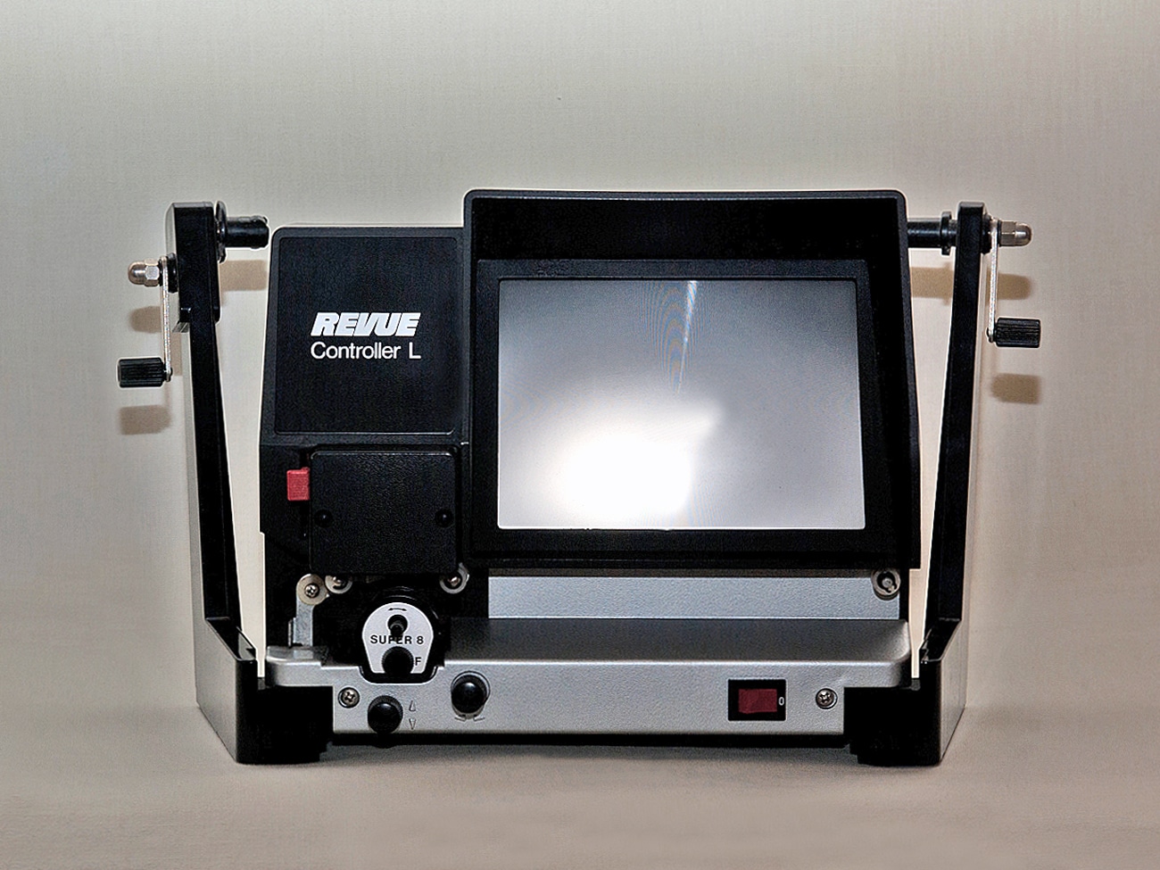 Filmbetrachter mit „Großbildschirm“ (100 x 140 mm dank Fresnellinse) von Foto Quelle für den Super-8-Film und – als Zusatzausstattung – auch den Normal-8-Schmalfilm. Spulen bis 180 Meter Filmlänge verwendbar. Halogenlampe: 6 Volt/10 Watt.