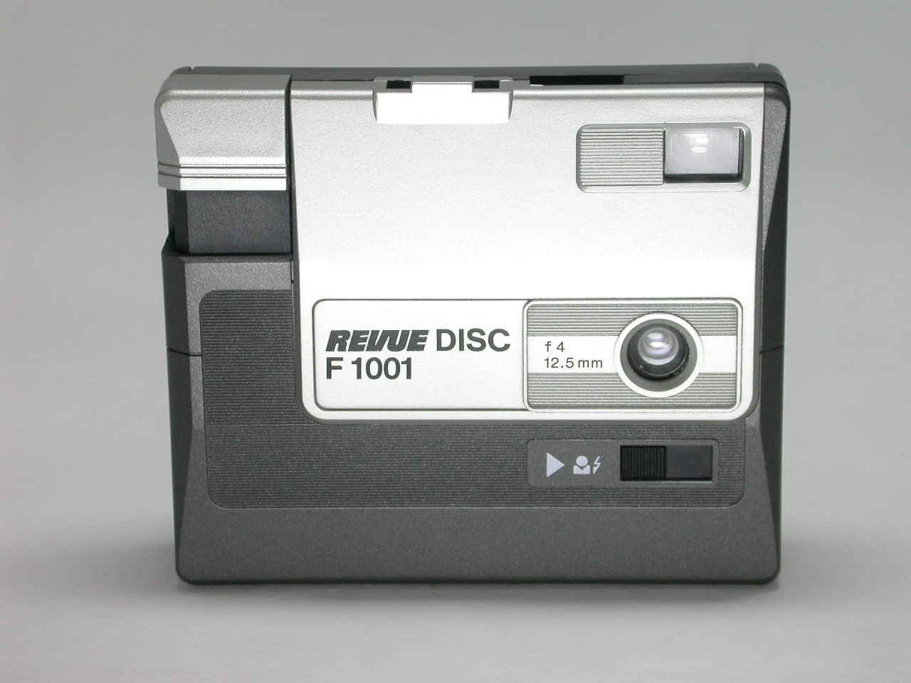 Einfache flache Kunststoffkamera von Revue (Foto-Quelle) für das längst wieder vom Markt verschwundene Disc-Format von Kodak (Aufnahmeformat 8 x 10,5 mm), hergestellt ab 1983 in Hongkong. Objektiv: Fixfokus 1:4/12,5 mm, Verschluss: 1/200 Sekunde. Blitzanschluss: Flipflash-Blitzschiene.