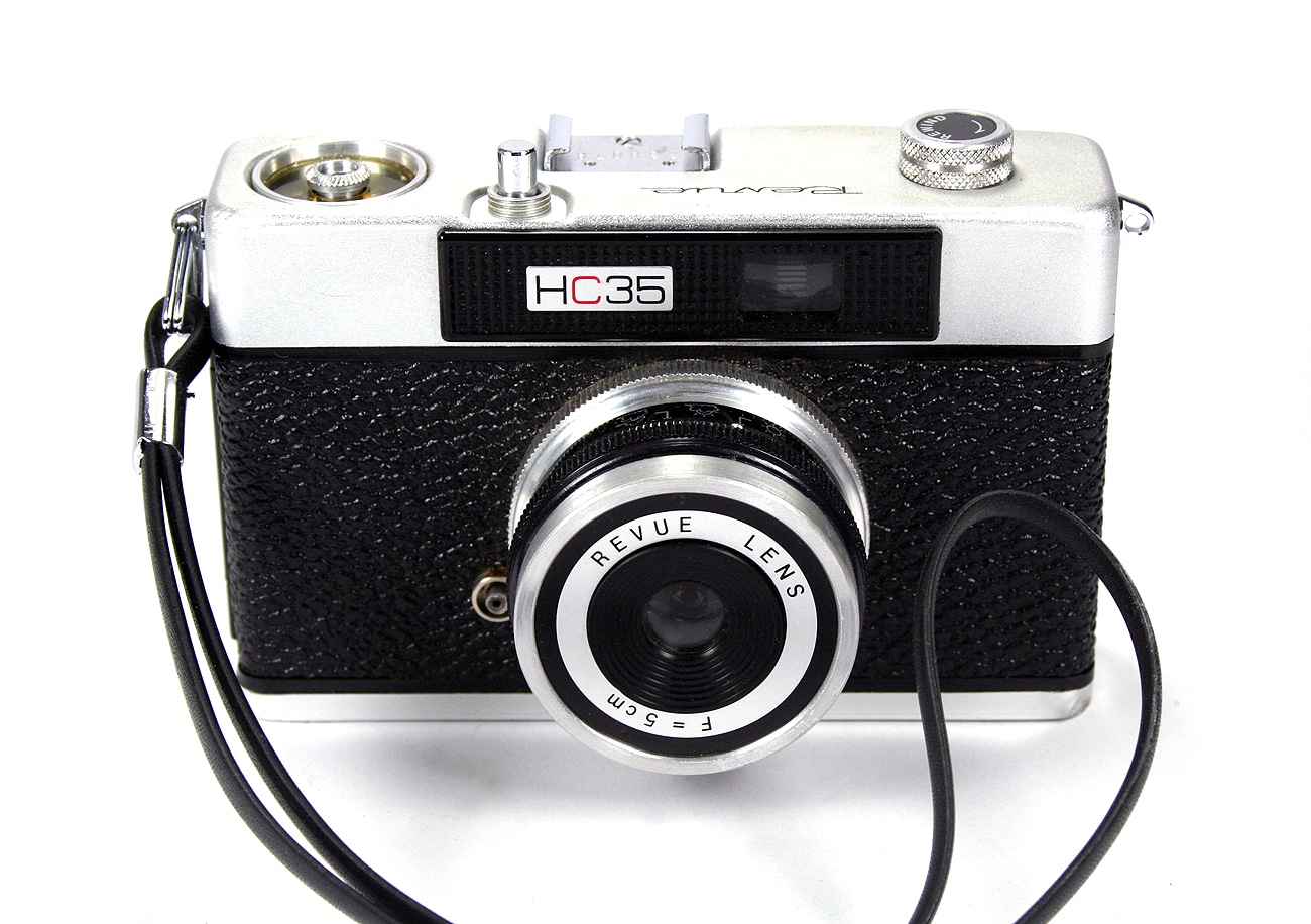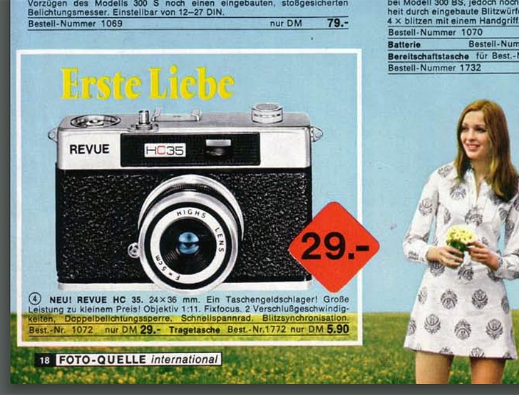 Einfache Sucherkamera für den Kleinbildfilm 135 (Aufnahmeformat 24 x 36 mm), hergestellt in Japan für Foto Quelle (Revue). Objektiv: Revue Lens 1:11/5 cm, Fixfokus, zwei Verschlussgeschwindigkeiten, Doppelbelichtungssperre, Schnellspannrad, Bildzählwerk, Zubehörschuh, Blitzsynchronisation. Auffällig: Für den Anschluss eines Drahtauslösers gibt es ein außenliegendes Gewinde am Auslöser, auf das eine „Glocke“ (typisch für Leica) aufgeschraubt werden kann, in die ein handelsüblicher Drahtauslöser eingeschraubt wird. Damaliger Preis: Katalog 1970/71 (Ausriss unten): 29,00 DM, Katalog 1971: 24,50 DM. Offensichtlich war die Kamera, „die mehr wert ist als sie kostet“ (Werbeaussage) kein rechter Verkaufserfolg: Im Katalog 1971/72 wurde der als „Taschengeldschlager“ beworbene Apparat für 19,90 DM in der Rubrik „Fundgrube“ verramscht – „so lange Vorrat reicht“.