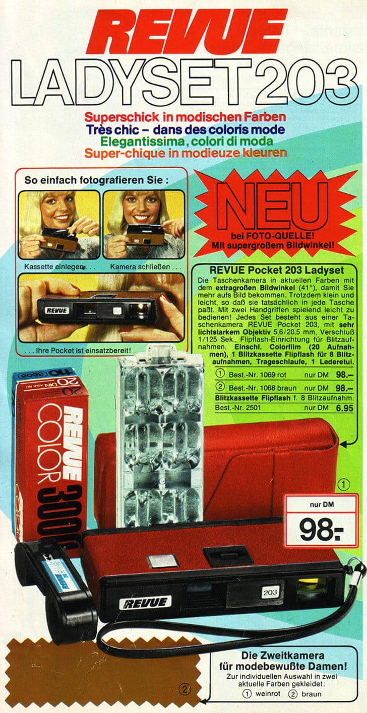 Sucherkamera für den Pocketfilm 110 (Aufnahmeformat 13 x 17 mm), ab 1977 im Angebot von Foto-Quelle. Objektiv: Weitwinkel 1:5,6/20,5 mm mit einem Bildwinkel von 41 Grad, Fixfokus; Einfachverschluss (1/125 Sekunde), manuelle Belichtungssteuerung, Blitzanschluss: Flashbar. Die Kamera gab es in zwei Farbversionen: in Weinrot und Braun (im Bild). Laut Katalog: „Die Zweitkamera für modebewusste Damen!“