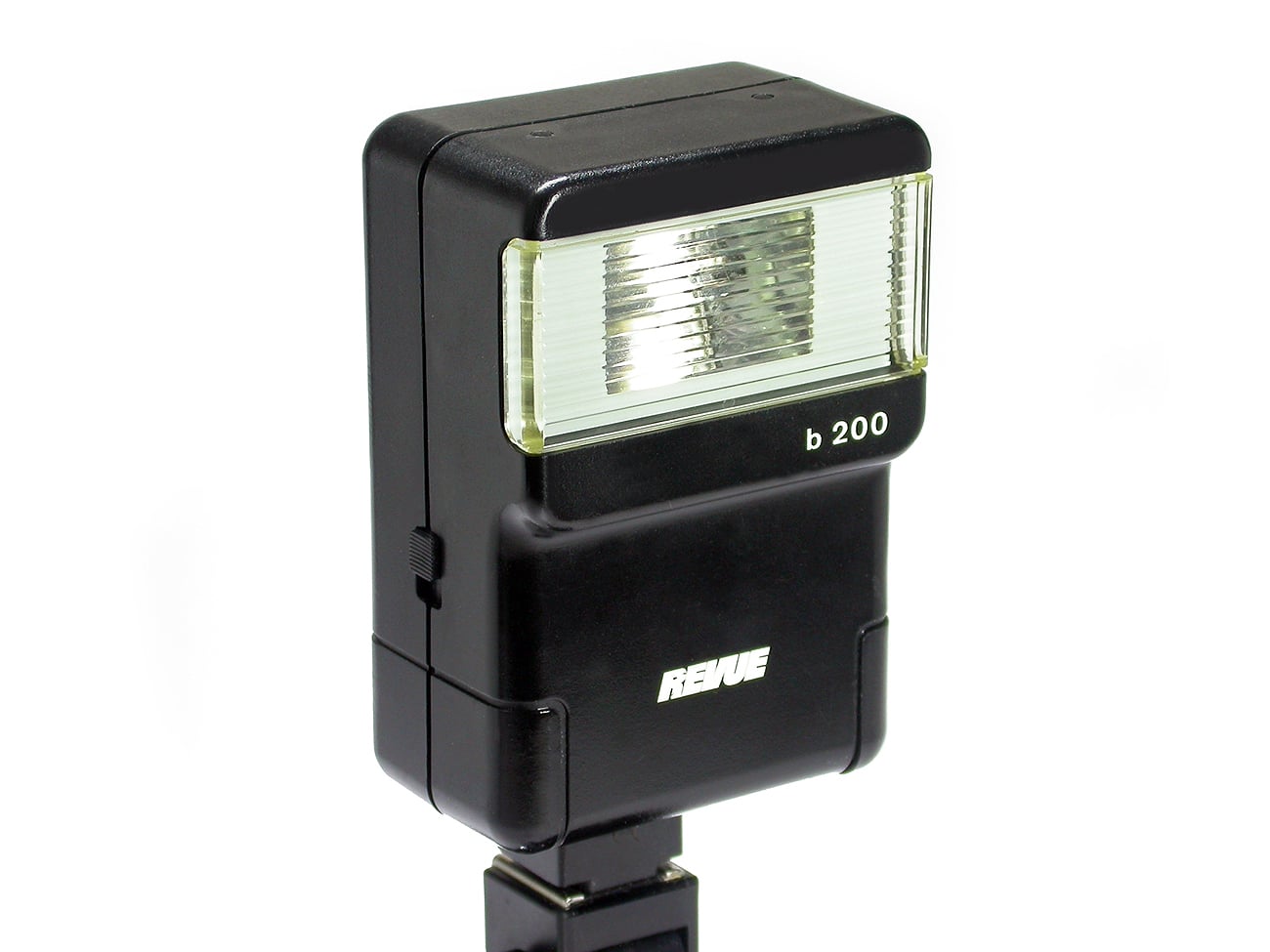 Einfaches, kleines Elektronenblitzgerät, Made in Germany, vertrieben von Revue (Foto Quelle, Artikel Nr. 2558) in den 1970er oder 1980er Jahren. Leitzahl 20 bei 21 DIN; Blendenschieber zum Einstellen der Filmempfindlichkeit auf der Rückseite. Blitzdauer 1/2.200 Sekunde, Blitzfolgezeit etwa 10 Sekunden. Ausleuchtwinkel 45 x 58 Grad. Synchronisation über Mittenkontakt oder Kabelanschluss, Handauslöser. Stromversorgung: 2 x Mignonzellen; etwa 100 Blitze mit einer Batterieladung möglich.