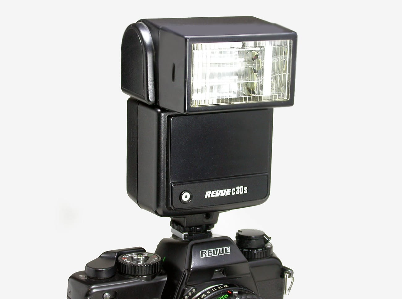 Computergesteuertes Blitzgerät, Mitte 1980er Jahre, aus japanischer Produktion. Leitzahl 30; Automatik (drei Blendenbereiche), Dreh- und Schwenkreflektor, Stromversorgung: 4 x Mignonzellen 1,5 Volt (Batterie oder NC). Zum Beispiel für Kamera Revueflex AC 3s.