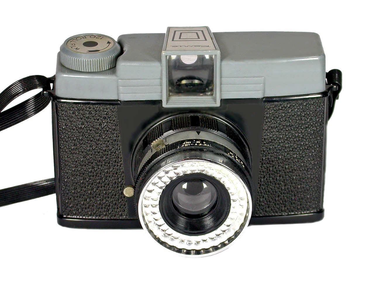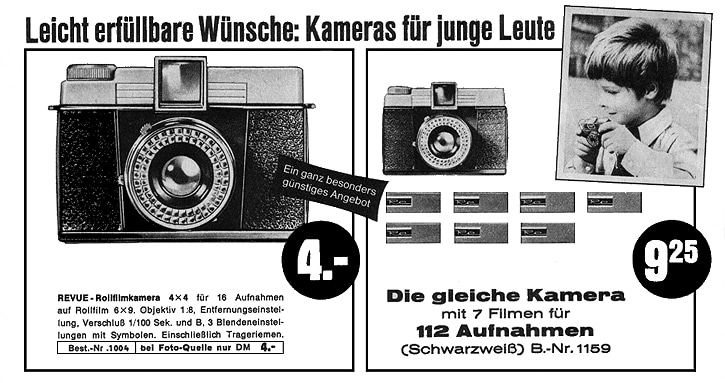Einfache Sucherkamera für den Rollfilm 120 (Aufnahmeformat 4 x 4 cm; 16 Aufnahmen pro Film) von Revue (Foto Quelle), weitgehend baugleich mit Kameras der Diana-Serie, Mitte der 1960er Jahre, Hongkong. Objektiv 1:8, Blendeneinstellung nach Symbolen; Verschlusszeiten (laut Foto-Quelle-Katalog von 1965/1966): 1/100 Sekunde und B. Unterschiede zur Diana-F: Kein Blitzanschluss, größerer Sucher, Andeutung von Belichtungsmesserwaben rund um das Objektiv (ohne Funktion). Plastikgehäuse, Plastikriemen.