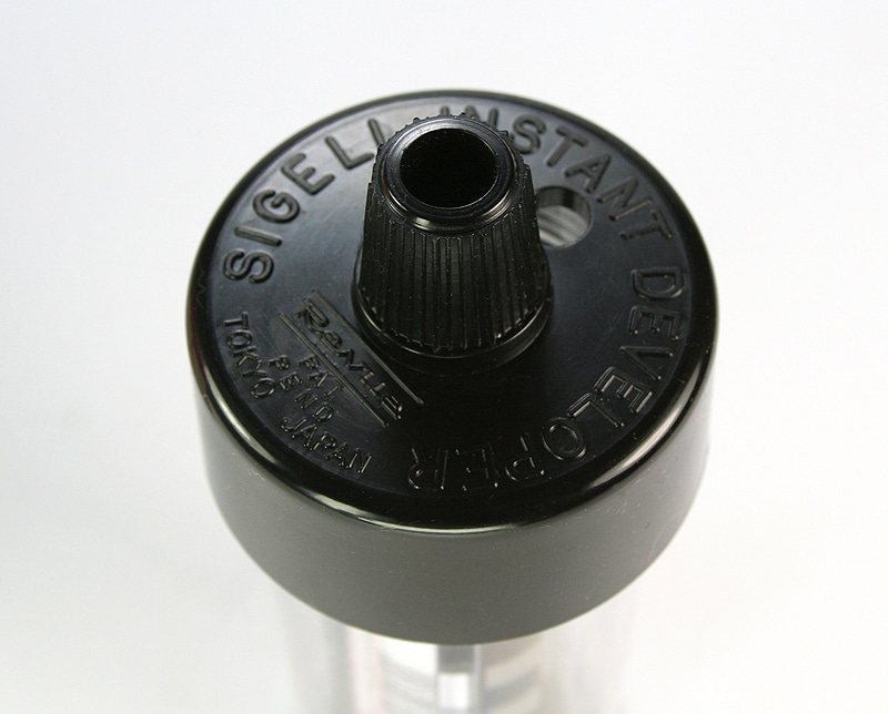 Vorgehensweise: Den geschlitzten Plastikstift in den Kern der geschlossenen Patrone fest einschieben, die Patrone dann in das Döschen stecken, Einbadentwickler einfüllen, dann nach bestimmten Regeln mehrfach in jede Richtung drehen und in vier Minuten ist der Film entwickelt und fixiert (steht aber nicht ausdrücklich dabei). Dann nur noch wässern und trocknen. Hier ist die Original-Bedienungsanleitung (pdf) zum kostenlosen Download. Trotz Beschränkung auf kurze Filme mit maximal 20 Bildern ist wohl kaum genügend Zwischenraum zwischen den einzelnen Windungen für die Flüssigkeit. Eine Original-Bedienungsanleitung für den Sigell beschreibt denn auch das Umstecken der Filmspule in eine größere Spezialpatrone, nachdem ein schwarzer Papierstreifen als Lichtschutz an das Filmende geklebt und komplett eingespult wurde. Dies geht angeblich auch mit 36 Bildern je Film, Ergebnis trotzdem fraglich. Kaufpreis bei Revue: 4,95 DM.