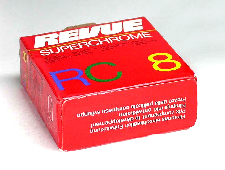 Die Super-8-Filme wurden im Mai 1965 eingeführt. Hier eine ungeöffnete Verpackung mit einem Revue-Film (Foto Quelle). Filmlänge in solchen Patronen: 15,25 Meter (etwa 2,5 Minuten). Farb-Stummfilm mit 40 ASA (17 DIN) Empfindlichkeit. Hersteller: Ferrania, Italien.