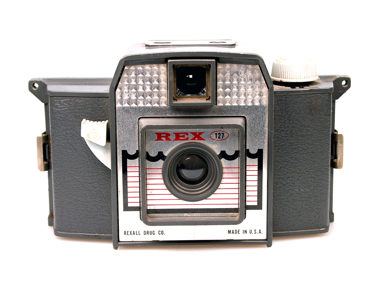 Seltene amerikanische Sucherkamera für den Rollfilm 127, vertrieben von der Rexall Drug Co., vermutlich in den 1950er Jahren. Rexall war die größte US-Drogeriekette, die nach dem Franchise-Prinzip arbeitete. Objektiv ohne Bezeichnung; Fixfokus. Durchsichtsucher. Einfachverschluss; manuelle Belichtungssteuerung. Kunststoffgehäuse; oben zwei Blitzkontakte zum Aufstecken eines speziellen Blitzgerätes.