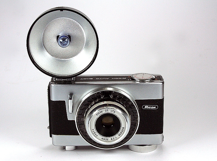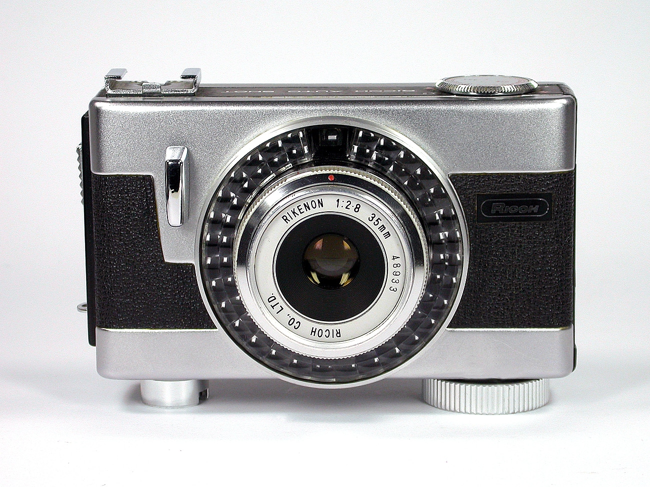 Sucherkamera (1960 bis 1966) für den Kleinbildfilm 135 (Aufnahmeformat 24 x 36 mm). Manuelle Schärfeeinstellung, Zweizeitenverschluss (1/30 und 1/125 Sekunde), Integralmessung, manuelle Belichtungssteuerung, eingebauter Federwerksmotor. Objektiv: Ricoh Rikenon 1:2,8/35 mm Seriennummer 48933. Zubehörschuh mit Mittenkontakt für den passenden E-Blitz.