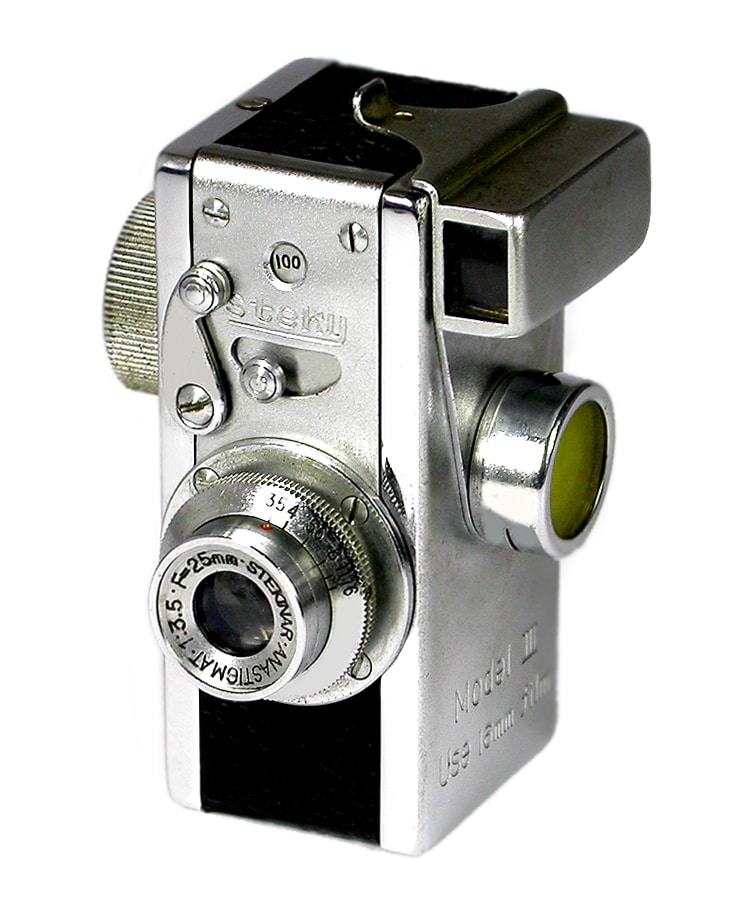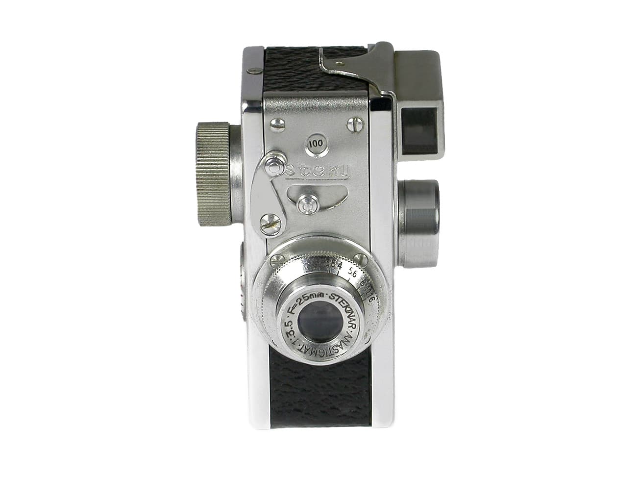 Da kommt die 140 Gramm leichte Steky III (1950 bis 1965) aus Japan schon eher in Frage: eine entzückende Miniaturkamera aus Metall für 16-mm-Film (Aufnahmeformat 10 x 14 mm) von Ricoh. Eine „richtige“ Sucherkamera, manuelle Belichtungssteuerung (B, 1/25, 1/50 und 1/100 Sekunde) und für manuelle Schärfeeinstellung. Wechselobjektive (Schraubgewinde), am Museumsexemplar ein Stekinar Anastigmat 1:3,5/25 mm. Die Steky III ist nur 65 mm kurz und nur 42 mm breit und tief!