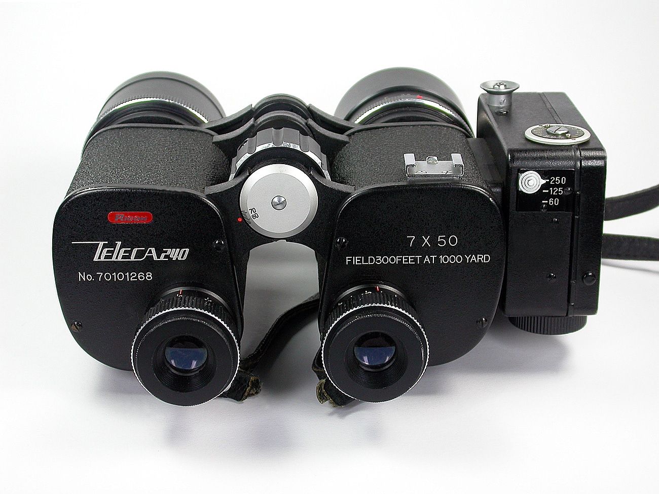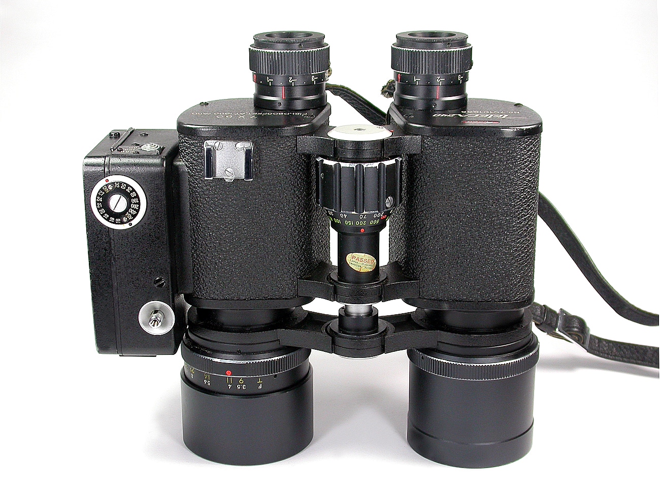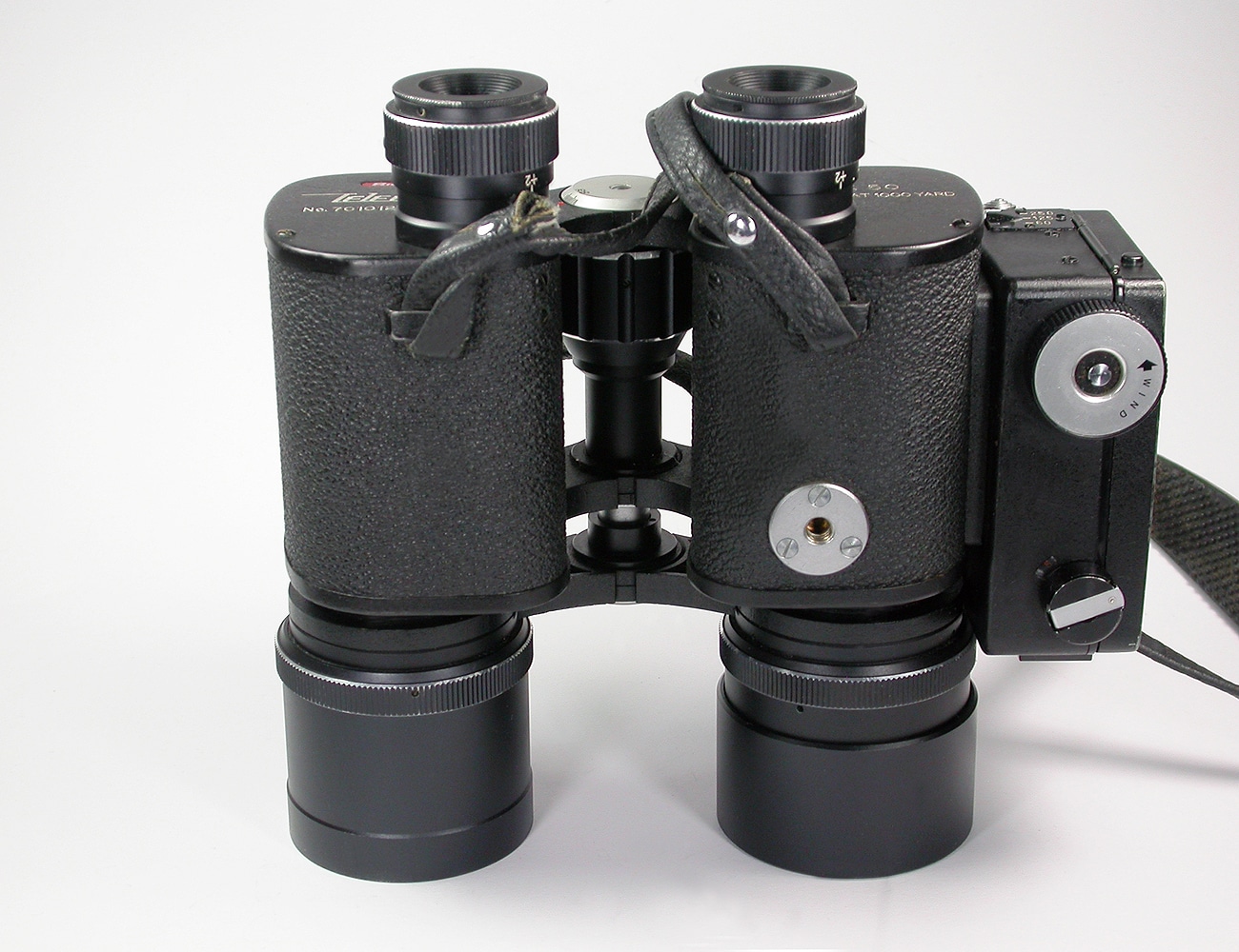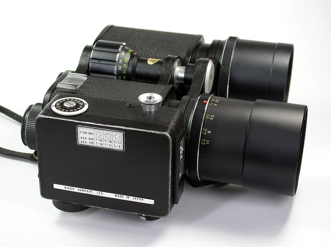 Massiv gebaute Fernglas-Halbformatkamera aus Metall, Ricoh, Japan, etwa ab 1971. Prinzipiell ein Fernglas mit der siebenfachen Vergrößerung und 50 mm Austrittsöffnung (7 x 50) mit seitlich angebauter Kamera entsprechend der Halbformatkamera Ricoh Half SE. Ein Strahlenteiler in einem der Monokulare leitet das Licht in die Kamera. Der sonst in der Ricoh Half eingebauten Selen-Belichtungsmesser fehlt hier. Deshalb gibt es oben einen Zubehörschuh für einen externen Belichtungsmesser. Copal-Verschluss mit den Belichtungszeiten 1/60, 1/125 und 1/250 Sekunde. Blenden: 1:3,5 bis 1:11, manuelle Schärfeeinstellung (für beide Okulare getrennt anpassbar). Für Kleinbildfilme bis 36 Aufnahmen (ergibt beim Halbformat 18 x 24 mm maximal 72 Bilder pro Film). Objektiv(e): Rikenon 1:3,5/165 mm (entspricht etwa 250 mm bei 35-mm-Vollformatkameras). Das Gerät besitzt auch ein massiv ausgeführtes Stativgewinde, eine Filmmerkscheibe sowie eine ausziehbare Gegenlichtblende am Aufnahmeobjektiv. Reflexsucher mit Fadenkreuz. Schärfeeinstellung: Mitteltriebeinstellung 20 Meter bis unendlich. Filmtransport: Federwerksmotor für kontinuierlichen Durchzug von rund 15 Aufnahmen.