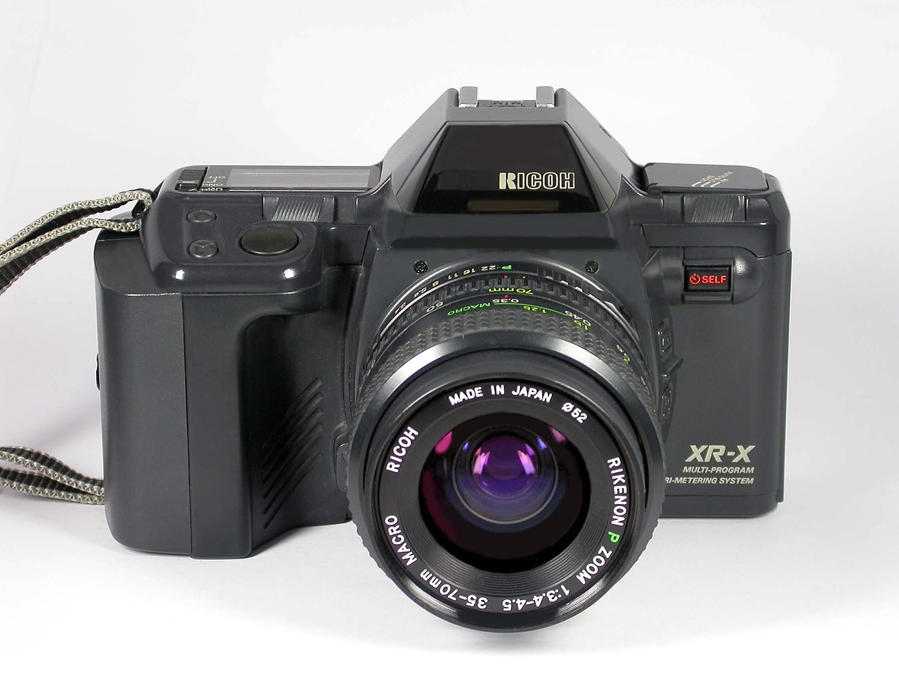 Gut ausgestattete einäugige Spiegelreflexkamera für den Kleinbildfilm 135 (Aufnahmeformat 24 x 36 mm), hergestellt von Ricoh, Japan, ab 1987. Für Wechselobjektive mit RK-Bajonett (Ricoh-System, für alle Objektive mit Ricoh P- und K-Bajonett), hier mit Rikenon P Zoom 1:3,4-1:4,5/35-70 mm Macro. Prismensucher; Mattscheibe mit Schnittbildindikator und Mikroprismenring, auswechselbar; Sucheranzeigen: Belichtungsmodus, TV-Modus, Verschlusszeit, Blende, Belichtungskorrektur, Gegenlichtautomatik, Spotmessung, Messwertspeicherung, Über- und Unterbelichtungswarnung, Aufhellblitz, Blitzbereitschaft, Zahl der verbleibenden Aufnahmen. Elektronisch gesteuerter Schlitzverschluss (B, 30 Sekunden bis 1/2.000 Sekunde, Selbstauslöser, Intervallauslöser, Fernbedienungsbuchse). TTL-Belichtungsmessung; Multi-Programmautomatik (manuelle Belichtungssteuerung, Blenden-, Zeit- und Programmautomatik). Motorischer Filmtransport; LED- und LCD-Anzeige; Blitzautomatiken mit Spezialblitzgeräten (zum Beispiel Ricoh XR Speedlite 300 P).