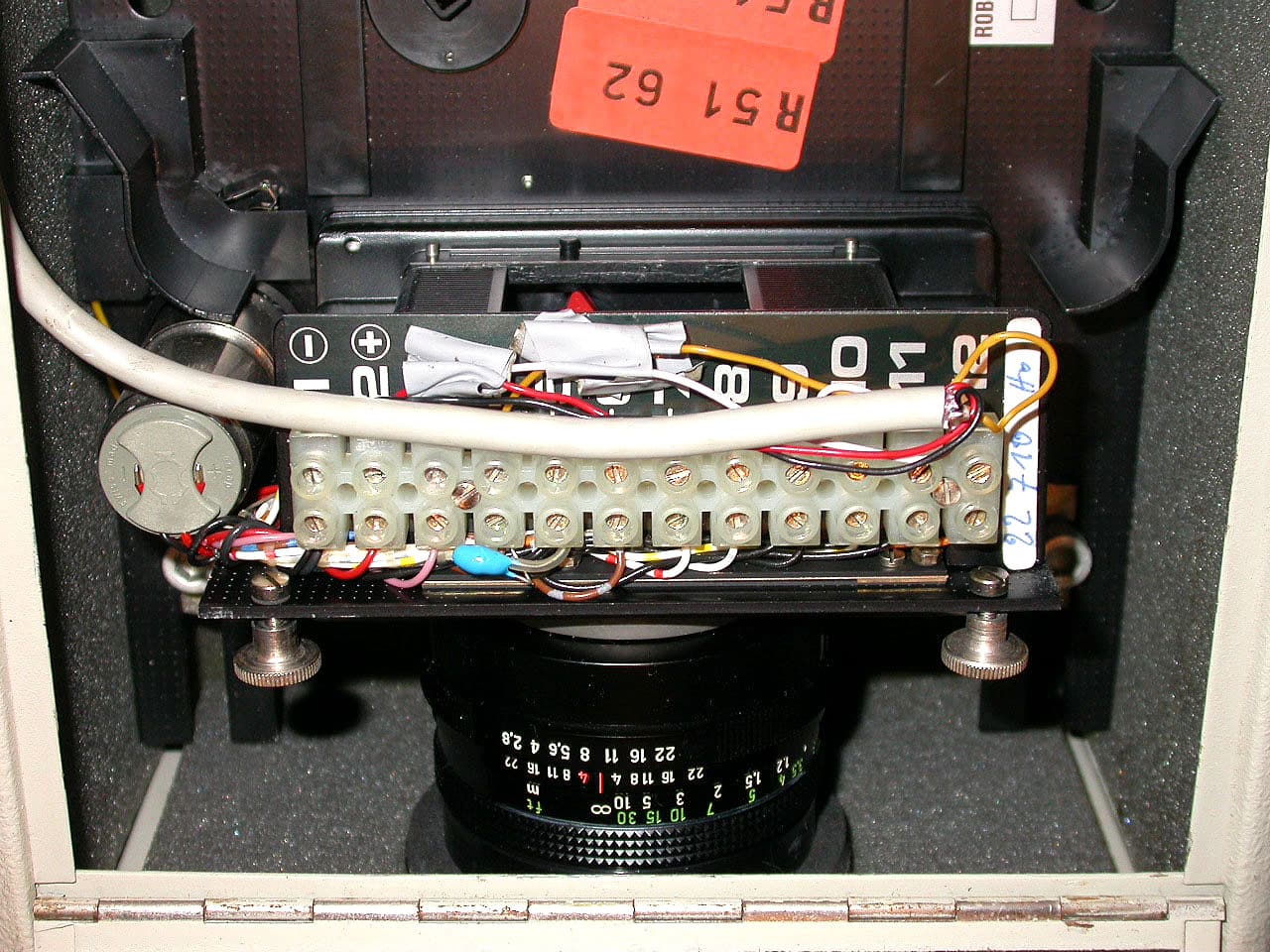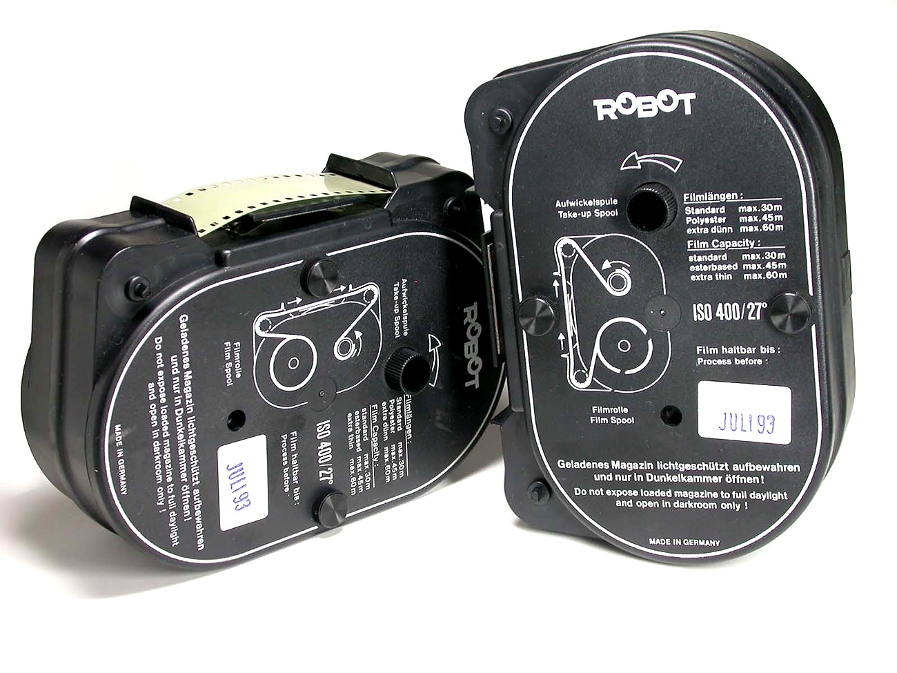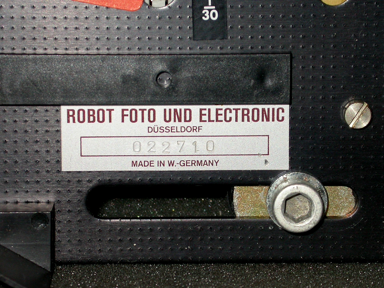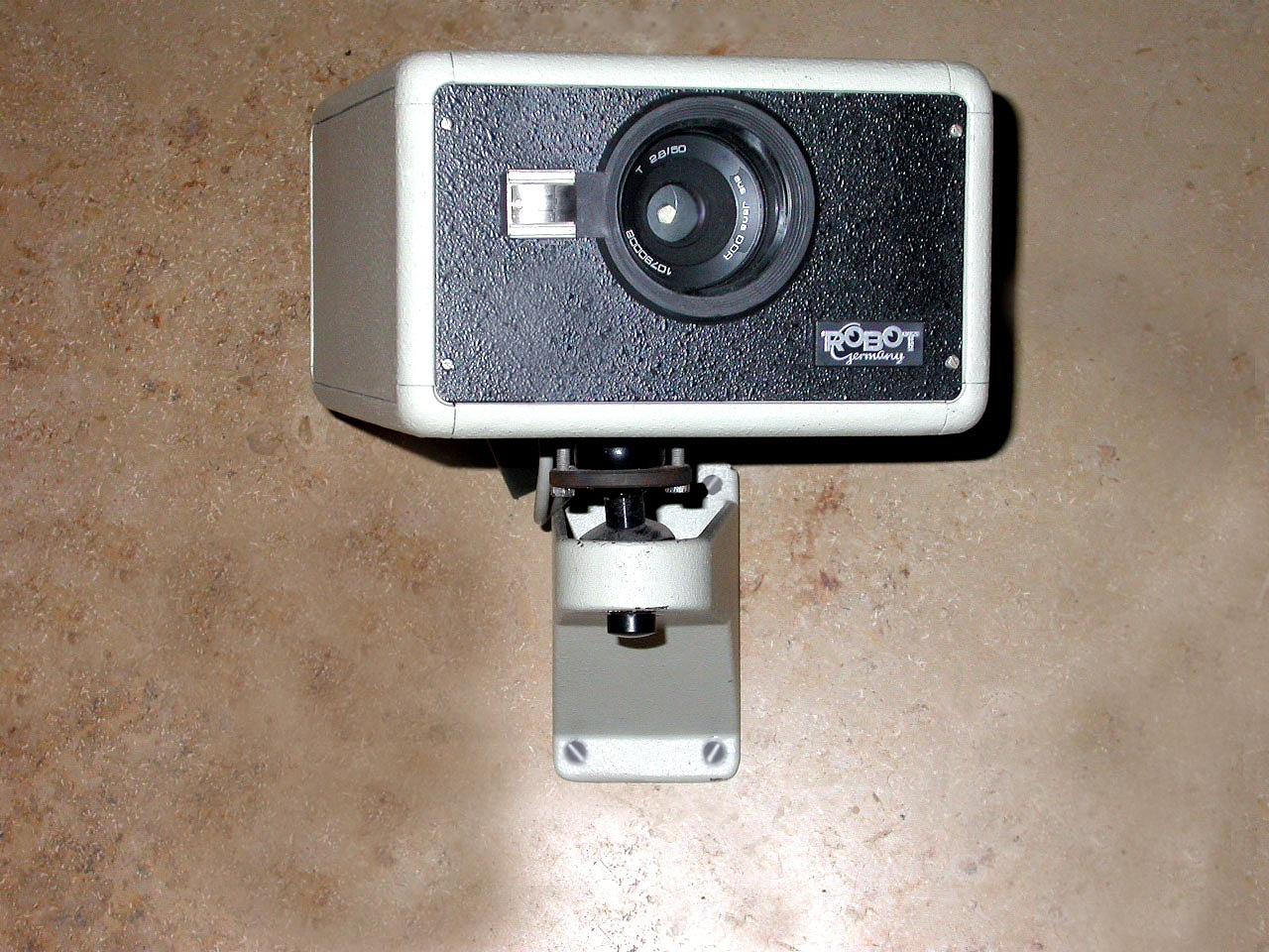 Schwere mechanische Überwachungskamera (für Banken usw.) von „Robot Foto und Electronic, Düsseldorf“. Eingebaut in ein massives Gehäuse aus Stahlblech (etwa 19 x 25 x 12 cm) ist eine spezielle Kleinbildkamera, bei der Filmtransport und Rotorverschluss durch einen Elektromotor angetrieben werden. Das handelsübliche Wechselobjektiv 1:2,8/50 mm („aus Jena DDR“, wahrscheinlich ein Tessar) war auf eine bestimmte Entfernung und Blende eingestellt. Ausgelöst wurde mittels mehrpoligem Kabel durch Fernschalter. Links neben dem Objektiv ist ein Zubehörschuh angebracht. Hergestellt Mitte der 1970er Jahre. Nahezu geräuschlos waren bis zu 580 Bilder im Aufnahmeformat 18 x 18 mm auf Kleinbildfilm möglich.