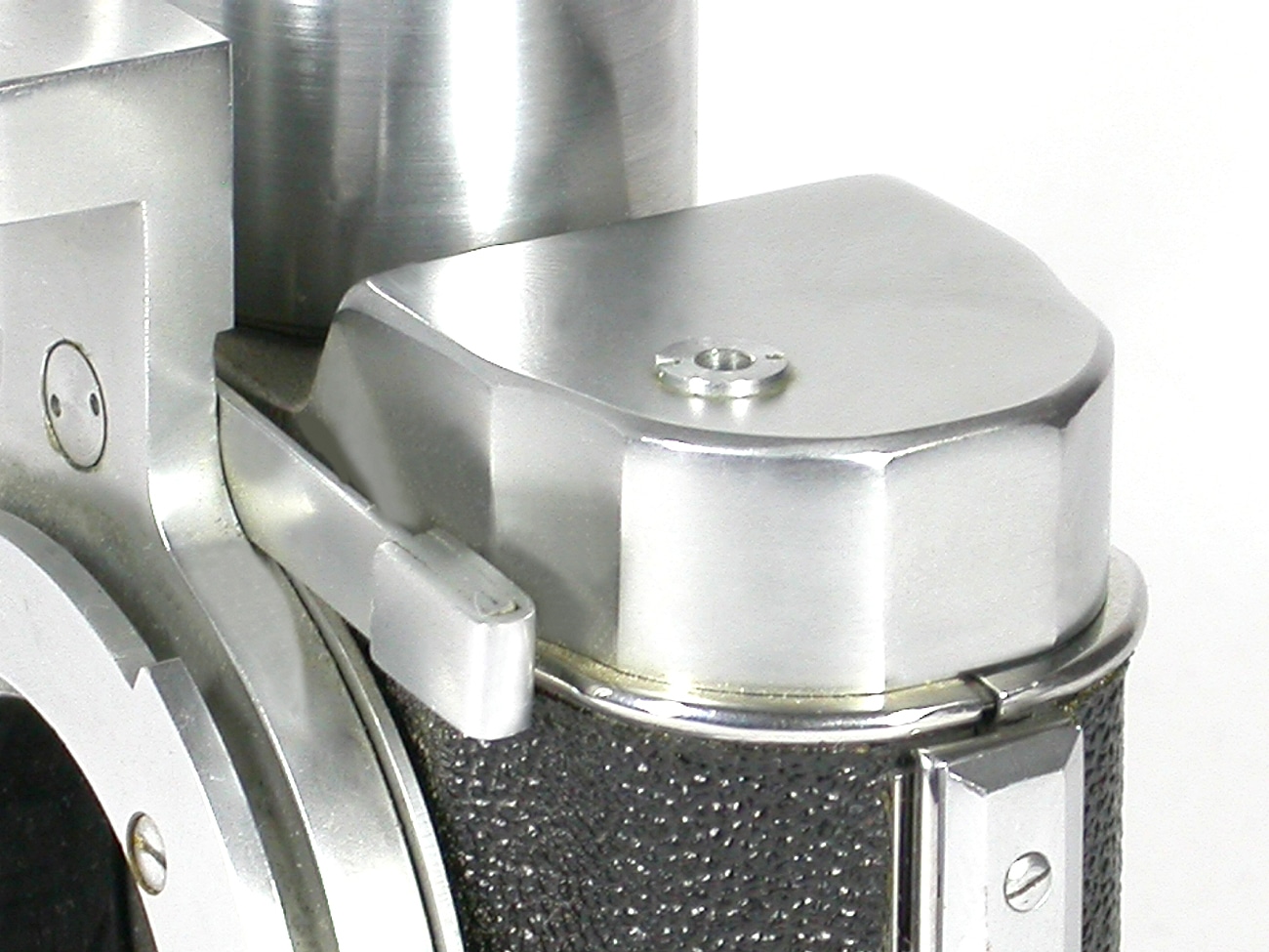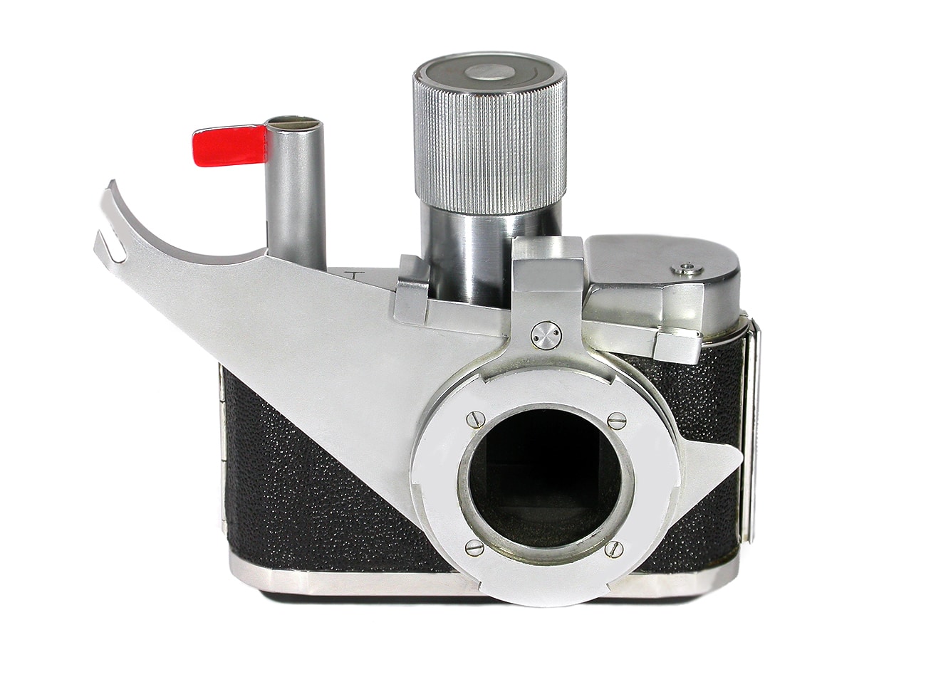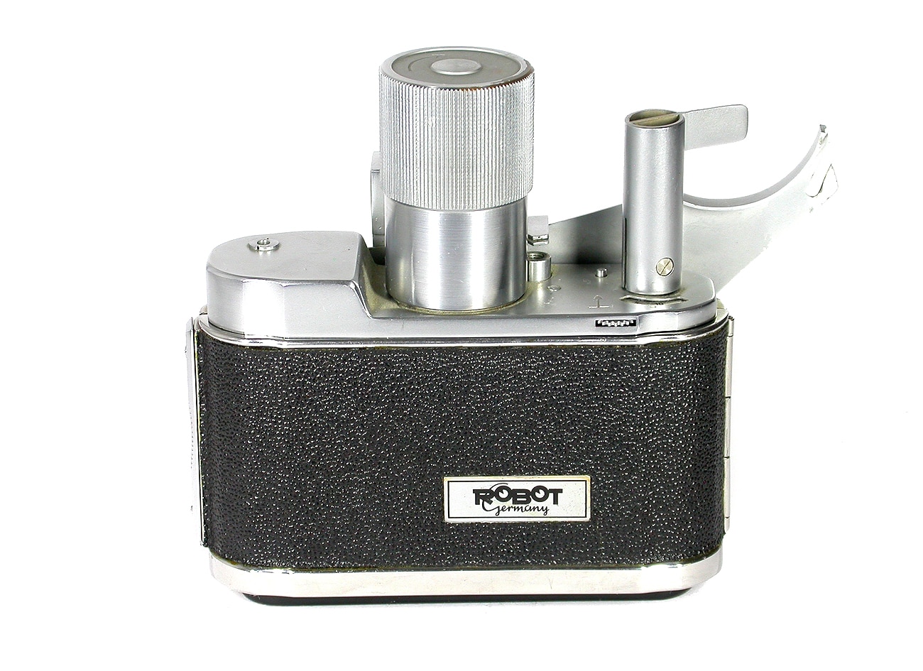 Dieser Robot (wie die Fachleute sagen – nicht: die Robot) ist ausweislich der Seriennummer ein Robot II, aber ein spezielles Modell für Registrieraufgaben. Diese Kamera hat keinen Sucher und kein Zeiteneinstellrad. Es fehlt auch die Synchronbuchse für den Blitz. Die schräge Metallplatte im Bild vorne links ist der Auslöser.