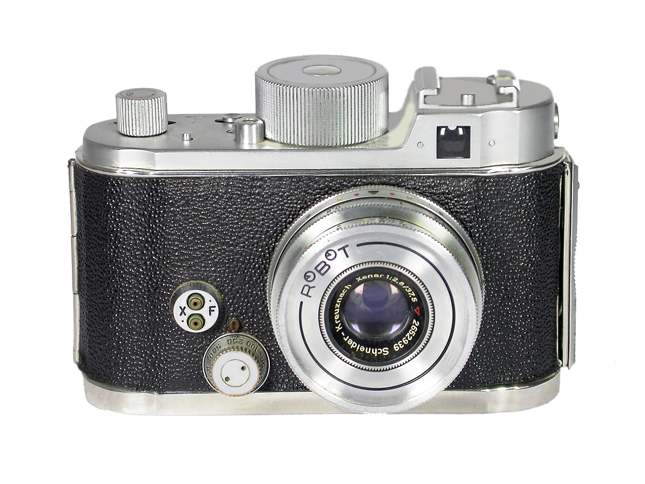 Sucherkamera für den Kleinbildfilm 135 (Aufnahmeformat 24 x 24 mm) von Otto Berning & Co., Düsseldorf, von 1951 bis 1955 gebaut. Filmtransport durch Federmotor (das geriffelte Metallrad oben beherbergt die Feder), kombiniert mit Rotationsverschluss. Der Universalsucher besitzt Parallaxenausgleich; auf den Zubehörschuh konnte ein Universalsucher aufgesteckt werden, um den Sucherausschnitt an die Wechselobjektive anzupassen. Der Robot (wie die Fachleute sagen – nicht: die Robot) kann dank seiner sinnreichen Farbpunkteinstellung an den Objektiven in Verbindung mit der ausgedehnten Schärfentiefe der kurzbrennweitigen Objektive einen eingebauten Entfernungsmesser durchaus entbehren. Dieses Exemplar ist mit dem Objektiv Schneider-Kreuznach Xenar 1:2,8/37,5 mm, Seriennummer 2652939, ausgerüstet. Hier ist sogar das Fotografieren um die Ecke möglich: Es gibt seitlich einen zweiten Suchereinblick, auf den umgeschaltet werden kann.