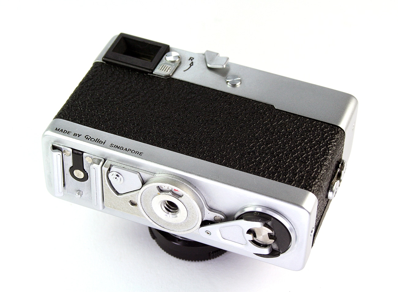 „Deutsche“ KB-Sucherkamera, gebaut in Singapur, Bauzeit ab 1974. Das Spitzenmodell der 35er Serie mit einem Sonnar 1:2,8/40 mm Rollei-HFT, „Made by Rollei Singapore“, versenkbar, Seriennummer: 2739512. Rollei-Compur-Zentralverschluss mit den Zeiten: B, 1/2 bis 1/500 Sekunde, CdS-Nachführbelichtungsmessung. Sehr kleine Kamera: 97 x 58 x 33 mm, 270 Gramm schwer. Seitliche Öse für Befestigung einer Handschlaufe. Der Blitzschuh befindet sich wie bei allen Rollei-35-Kameras ungewöhnlicherweise auf der Bodenplatte.