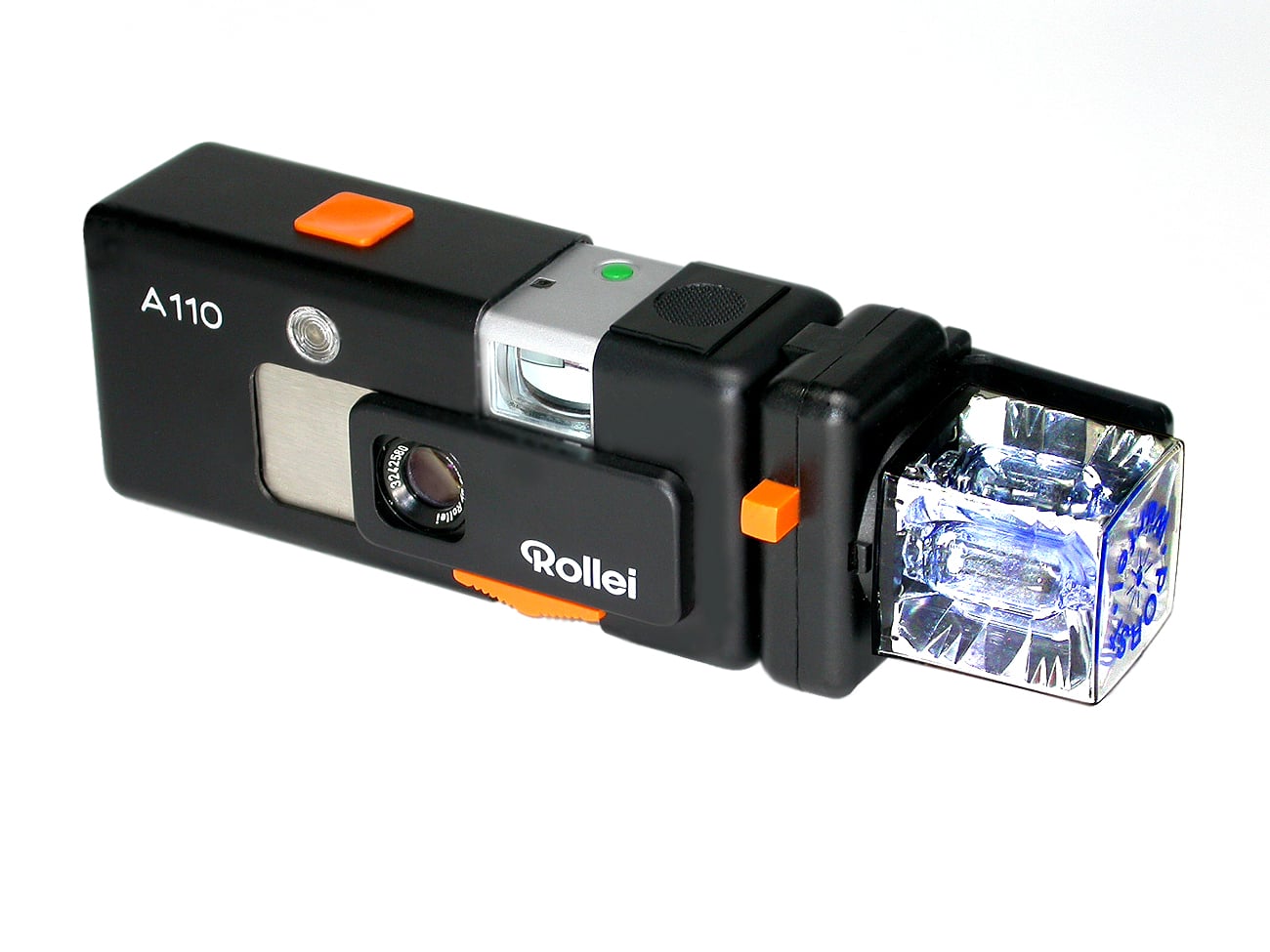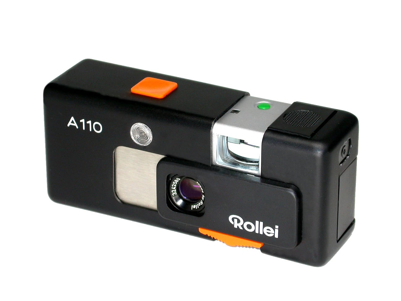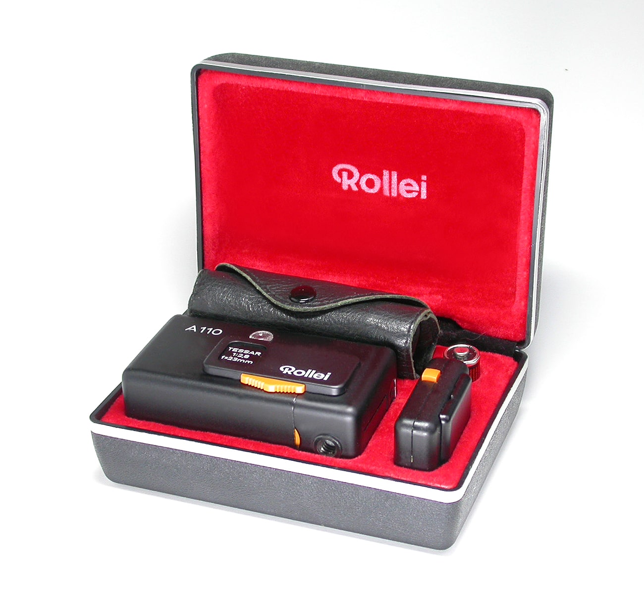 Miniaturkamera von Rollei für den 110er Pocketfilm in zwei Ausführungen – einmal „Made in Germany“ und einmal „Made in Singapore“ (im Bild). Der Singapur-Apparat stammt aus den Jahren 1978 bis 1981 (etwa 72.000 Stück), die deutsche Ursprungsversion stammt aus den Jahren 1974 bis 1978 (rund 124.000 Exemplare). Ungewöhnlich ist das Belichtungssystem: In Grundstellung ist der Verschluss offen und die Blende geschlossen. Nach Auslösen öffnet die Blende auf den vorgegebenen Wert, nach Ende der Belichtungszeit schließt der Verschluss. Beim Spannen und Filmtransport kehren Blende und Verschluss in ihre Ausgangsposition zurück. Die Messzelle für die Belichtung hat eine separate Blende, die mit der Objektivblende mechanisch gekoppelt ist. Belichtungsautomatik mit Verschlusszeiten von 4 Sekunden bis 1/400  Sekunde und Empfindlichkeiten von ISO 64 bis ISO 500. Das Objektiv, gefertigt von Rollei in Lizenz von Carl Zeiss Oberkochen, ist ein Tessar 1:2,8/23 mm (4 Linsen in 3 Gruppen, Naheinstellgrenze 1 Meter), Seriennummer: 3242580. Leuchtrahmensucher mit eingeblendeter Anzeige von Entfernung und Belichtung.