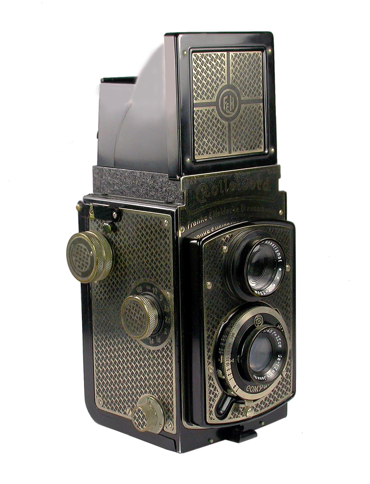 Zweiäugige Spiegelreflexkamera (1933 bis 1936) für den Rollfilm 120/620/B2 (Aufnahmeformat 6 x 6 cm) – die sogenannte Ur-Rolleicord. Manuelle Scharfeinstellung, Lichtschachtsucher, mechanischer Zentralverschluss (T, B, 1 bis 1/300 Sekunde). Manuelle Belichtungssteuerung. Aufnahmeobjektiv: Carl Zeiss Jena Triotar 1:4,5/75 mm, Seriennummer 1602702. Sucherobjektiv Heidoscop-Anastigmat 7,5 cm.