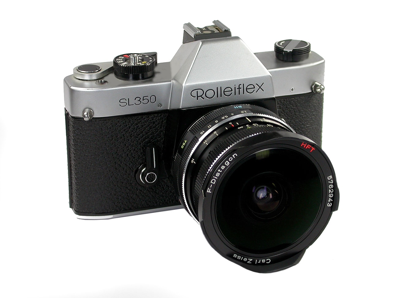 Zwei Raritäten auf einem Bild: die Rolleiflex SL 350 (von der es nur etwa 15.000 Exemplare in silber oder schwarz geben soll) und das formatfüllende Fischauge Carl Zeiss F-Distagon HFT 1:2,8/16 mm, das auch nicht gerade oft gebaut wurde. Die einäugige analoge Kleinbild-Spiegelreflexkamera (Made in Germany 1973/1974) besitzt einen mechanischen Schlitzverschluss bis 1/1.000 Sekunde. CdS/TTL-Offenblend-Messung mit Blendensimulator durch das Objektiv (QBM-Bajonett). Mit Belichtungsmesser gekuppelte und frei wählbare Einstellung von Belichtungszeit und Blende. Standardobjektiv: Carl Zeiss Planar 1:1,8/50 mm (ab 1974 mit Rollei HFT-Vergütung), Einstellbereich 0,45 m bis unendlich. Wechselobjektive: bis 1.000 mm Brennweite; M-42-Objektive über Adapter. Filmtransport: Schnellschalthebel für verschlussgekuppelten Filmtransport. Batterie: PX 13 oder PX 625.