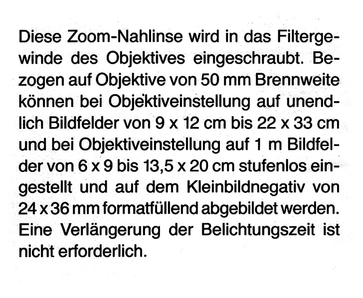 Ein Beispiel für die beliebten Zusatzgeräte der Siebziger Jahre, als man sich noch keine Balgengeräte oder Makroobjektive für Nahaufnahmen leisten konnte oder wollte. Für die damals noch weit verbreiteten Kameras mit Zentralverschluss gab es ohnehin keine entsprechenden Wechselobjektive. Diese Zoom-Nahlinse aus japanischer Herstellung in deutschem Vertrieb ermöglichte ordentliche Ergebnisse – viel Licht (Tiefenschärfe!) und Stativ vorausgesetzt. Dieser Vorsatz konnte mittels Adapterringen bei Filtergewinden von 49 bis 58 mm verwendet werden.