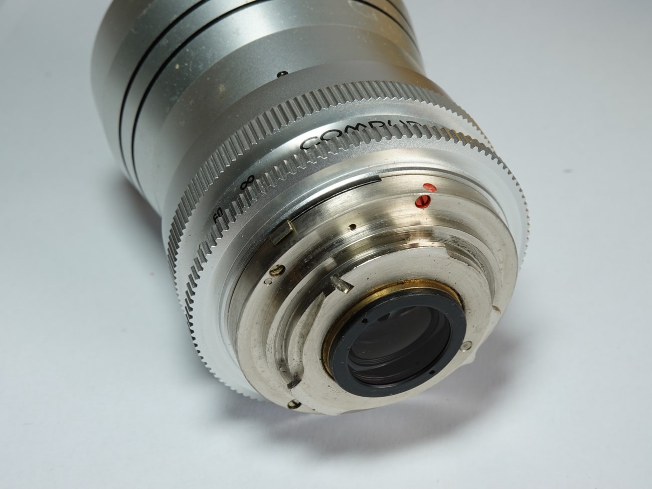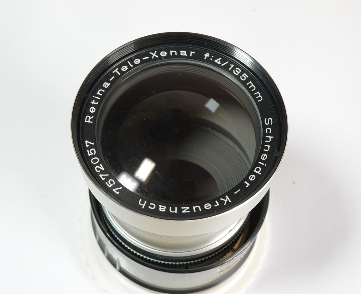 Teleobjektiv mit mittlerer Brennweite, passend zur Retina III S, Retina Reflex S und Retina Reflex III; manuelle Fokussierung. In der Originalverpackung (Plexiglassturz, Karton), mit Kodak Skylight Filter 60 -0L; der schwarze Zylinder unterhalb des Objektivs kann als Streulichtblende am Tele-Xenar verwendet werden.