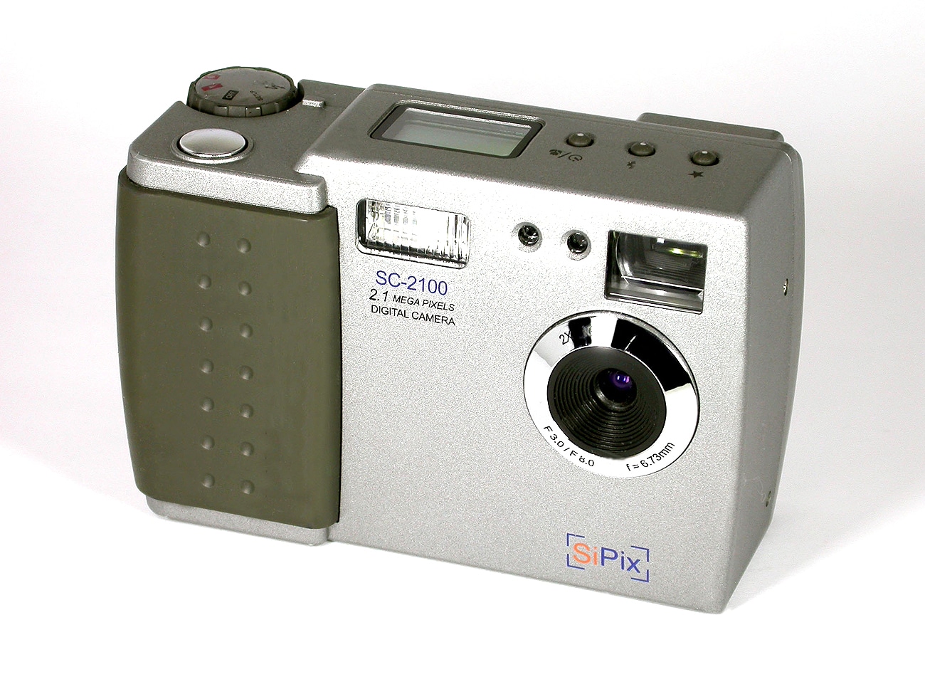 Seltene Digitalkamera made in China, 2001, Marke: SiPix Inc., USA: 1/2,7 Zoll CCD-Chip mit 2,1 Megapixeln, Auflösung: 1.600 x 1.200 Bildpunkte. Zweifaches digitales Zoom. Objektiv: Fixfokus mit sechs Linsen, Lichtstärke 1:3,0 bzw. 1:8,0 und Brennweite 6,73 mm (39 mm bezogen auf das Kleinbildformat). Optischer Sucher und 1,8 Zoll Color-LCD-Monitor. Verschlusszeiten: 1 bis 1/500 Sekunde, ISO: 80 bis 320. Compact-Flash-Card. USB- und Videoausgänge, Stativgewinde. Die SiPix SC-2100 wiegt 260 Gramm. Sie ist mit 11,5 x 5,0 x 7,7 Zentimetern vergleichsweise klobig. Energieversorgung: 4 x Mignon-Zellen AA oder Netzteil 6 Volt.