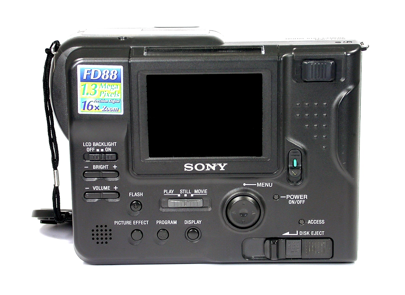 Frühe Digitalkamera (1999-2000) mit 1,3 Megapixel, Autofokus, 8-fachem optischen und 16-fachen Digitalzoom. Programmautomatik. Auflösung: 1.280 x 960 Pixel, 1.024 x 768 Pixel oder 640 x 480 Pixel, Farbtiefe: 24 Bit (16,7 Millionen Farben). Sensor: 1/3,6″ CCD-Chip mit 1,3 Millionen Pixeln. Dateiformat: JPEG oder MPEG-1-Video. Wechselspeicher: eine normale 3,5-Zoll-Diskette (1,44 MB), wie sie damals das einfache externe Speichermedium der PCs war, bevor es CD-ROMs, DVDs, USB-Sticks oder externe Festplatten gab. Objektiv: Sony 8-fach Zoom 4,75-38 mm (entspricht 41 bis 328 mm bei Kleinbild), digitales 16-fach Zoom. Belichtungszeiten: 1/30 bis 1/4.000 Sekunde. TFT-LCD-Monitor mit 84.000 Pixeln). Eingebautes Blitzgerät, Blitzreichweite: 2 bis 4 Meter. Selbstauslöser: 10 Sekunden. Mit der Kopierfunktion ließ sich der gesamte Disketteninhalt in der Kamera zwischenspeichern. Integriertes Mikrofon und Lautsprecher (mit Lautstärkeregelung). Stromversorgung: 1 x Lithium-Ionen-Akku.