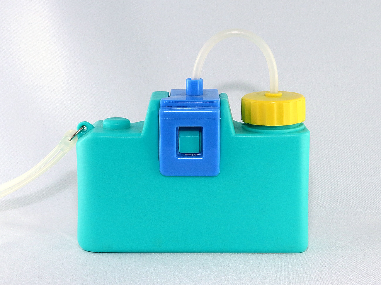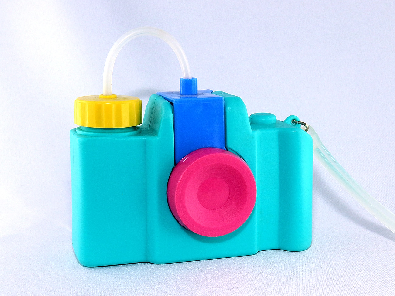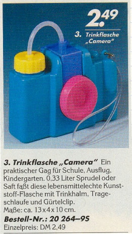 „Ein praktischer Gag für Schule, Ausflug, Kindergarten“ lockt die Beschreibung im Werbeartikelkatalog der Firma „Schneider-Werbegeschenke“. Kurt Tauber hat sich dieses Teil 1990 zugelegt, weil er als Kameraverrückter seine Tochter „standesgemäß“ für den Kindergarten ausstaffieren wollte. Die Trinkflasche „Made in Thailand“ aus lebensmittelechtem Kunststoff ist etwa 13 x 4 x 10 cm groß und fasst 0,33 Liter Sprudel oder Saft. Sie hat eine Trageschlaufe und besitzt einen praktischen Gürtelclip. Preis 1990: 2,49 DM.