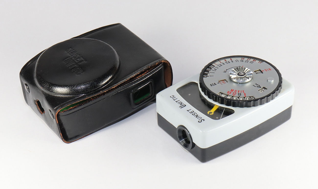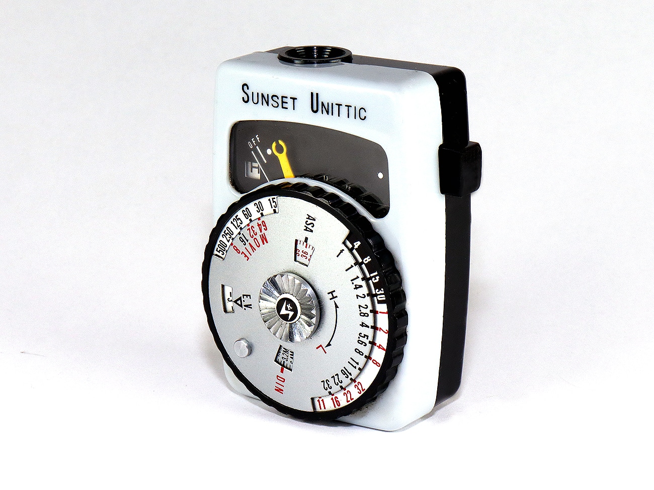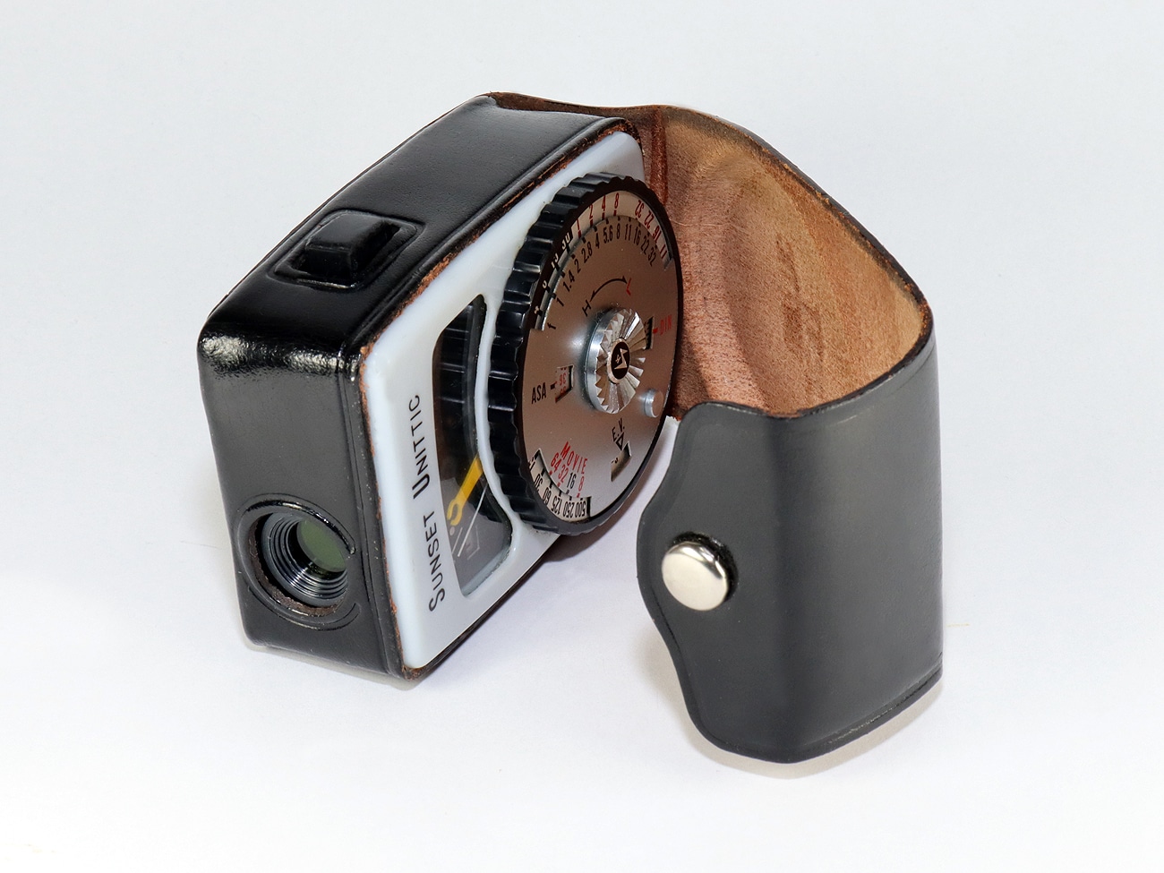 Japanischer CdS-Belichtungsmesser aus den 1960er Jahren der US-amerikanischen Handelsmarke Unittic im Lederetui. Die Firma Showa Koden in Japan soll nach Berichten im Internet der Hersteller sein. Unittic wiederum soll eine Tochter von Kowa gewesen sein.