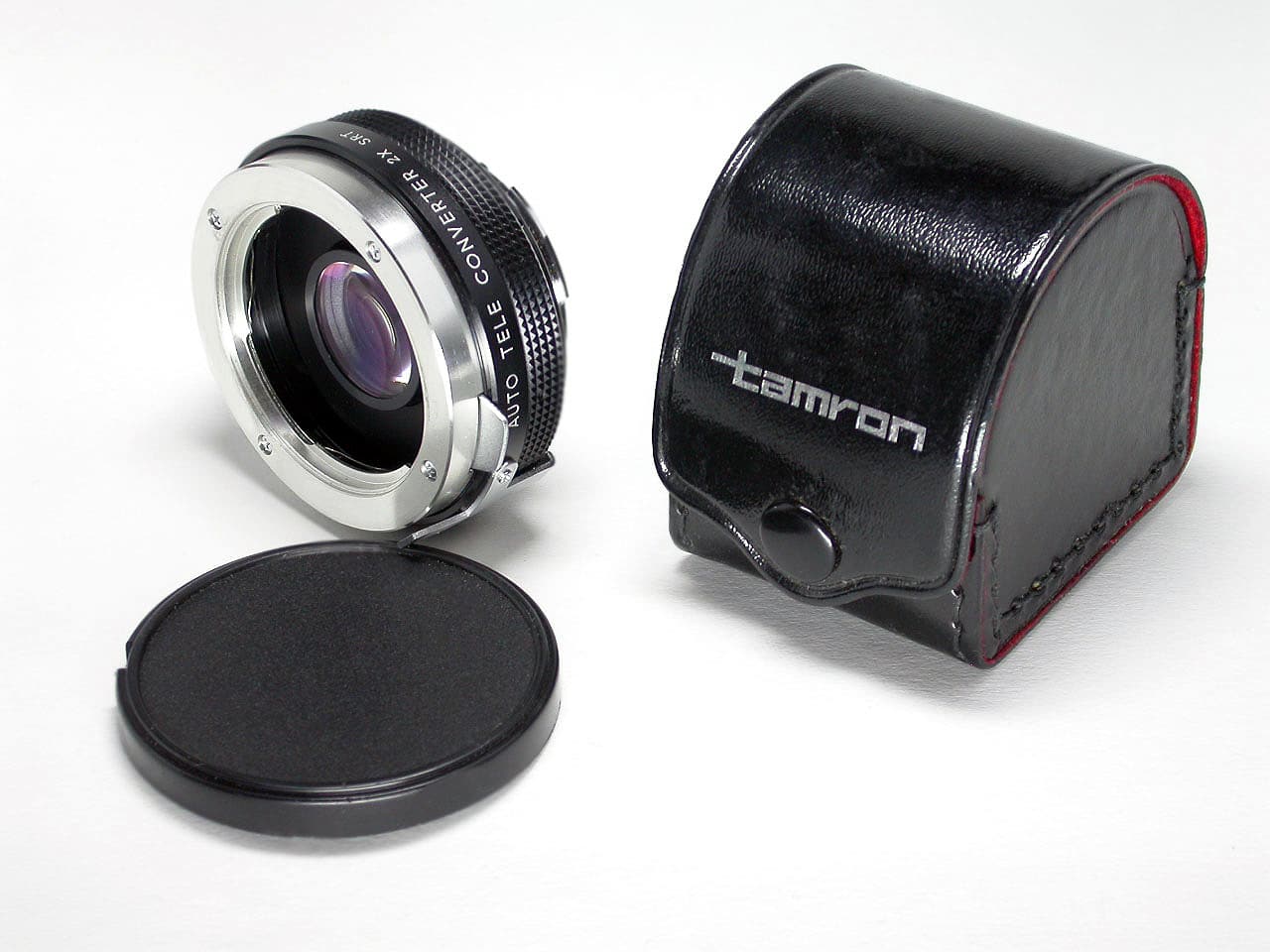 Zweifach-Telekonverter Tamron „Auto Tele Converter 2x SRT“ für Minolta SRT, Japan, 1970er Jahre. Die Automatikfunktionen der Kamera wurde erhalten, nur sank eben die Lichtstärke der Objektive um zwei Stufen, die Brennweite wurde hingegen verdoppelt. Diese Telekonverter waren damals beliebte, da kostengünstige Alternativen zu teuren Teleobjektiven. Die Qualitätseinbußen waren – je nach Verwendungszweck – natürlich schon deutlich. Für die damals üblichen grob gerasterten Schwarzweiß-Pressefotos der Tageszeitungen reichte es aber meistens.