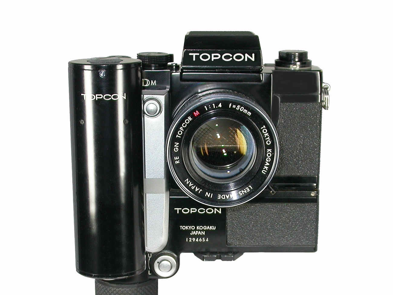 Das Flaggschiff der Topcon-Kamera-Familie, die Topcon Super DM mit dem großen Motor – ein Kamerasystem, das in den 1970er Jahren international durchaus erfolgreich mit Nikon und Canon konkurrierte.