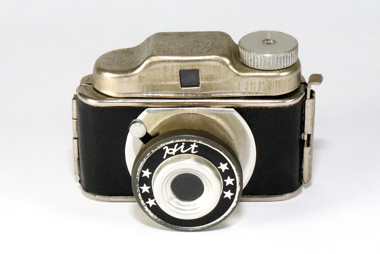 Japanische Kleinstbildkamera (1950er/1960er Jahre) im Aufnahmeformat 14 x 14 mm für einen speziellen Rollfilm. Fixfokusobjektiv. Mechanischer Zentralverschluss, manuelle Belichtungssteuerung. Kein Kinderspielzeug, sondern eine richtige kleine Kamera.