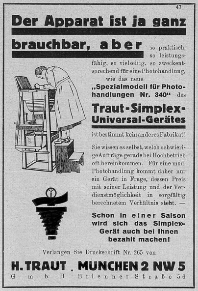 Die Firma Traut existierte schon vor 1900 und wurde von Heinrich Traut geführt, der 1901 eine Kamera namens Elektra, 1909 die Simplicissima herstellte. Später verlegte sich Traut auf Spezialgeräte für Fotografie und Reproduktion, verkaufte auch Reprokameras, die er zum Teil von Nikolaus Kammer (München) bezog.