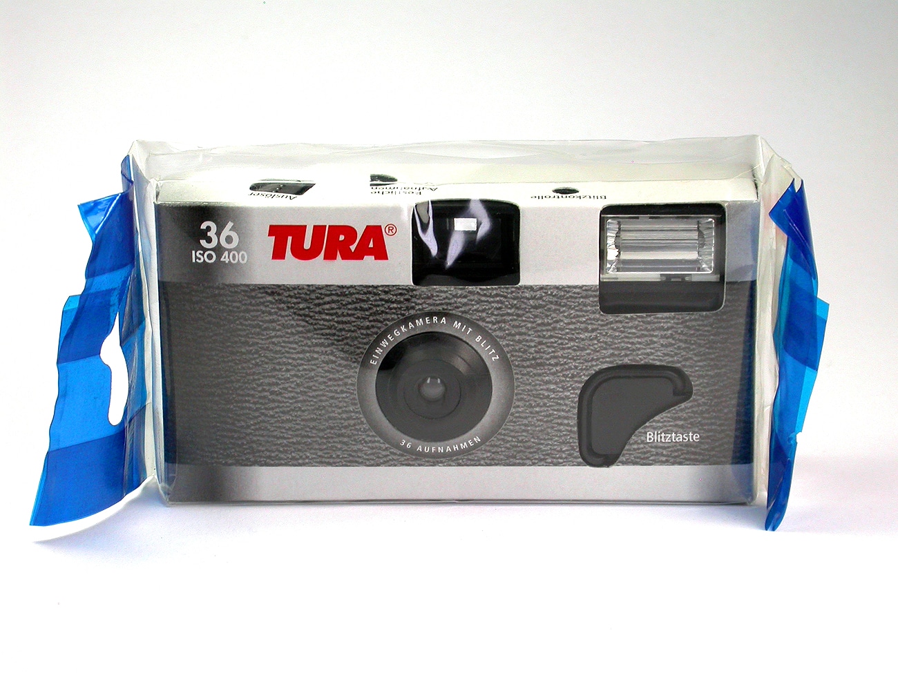 „Einwegkamera mit Blitz“ (so die Aufschrift auf dem Objektiv), Anfang der 2000er Jahre. Linse und Film (36 Aufnahmen, was eher ungewöhnlich ist, mit 27 DIN/400 ASA) des damaligen deutschen Filmherstellers Tura AG, Düren-Mariaweiler (gegründet 1901, Konkurs 2005). Eingebautes Blitzgerät. Keine weiteren Herstellerangaben.