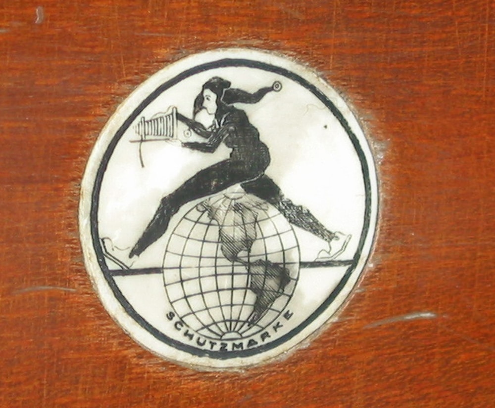 Ein Wiener Händler hat uns dieses Rätsel aufgegeben: Kennt jemand dieses Logo, Firmen- oder Händler-Signet? Es befindet sich an einer antiken Reisekamera aus Holz, die ansonsten unbezeichnet ist.