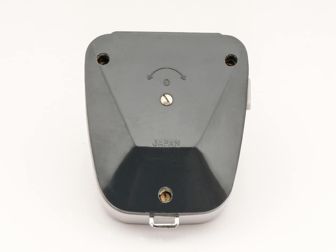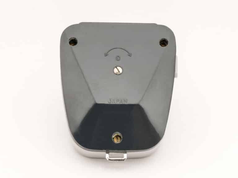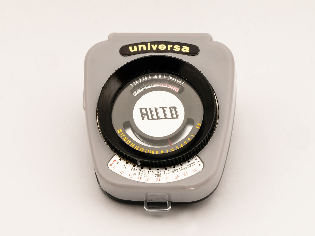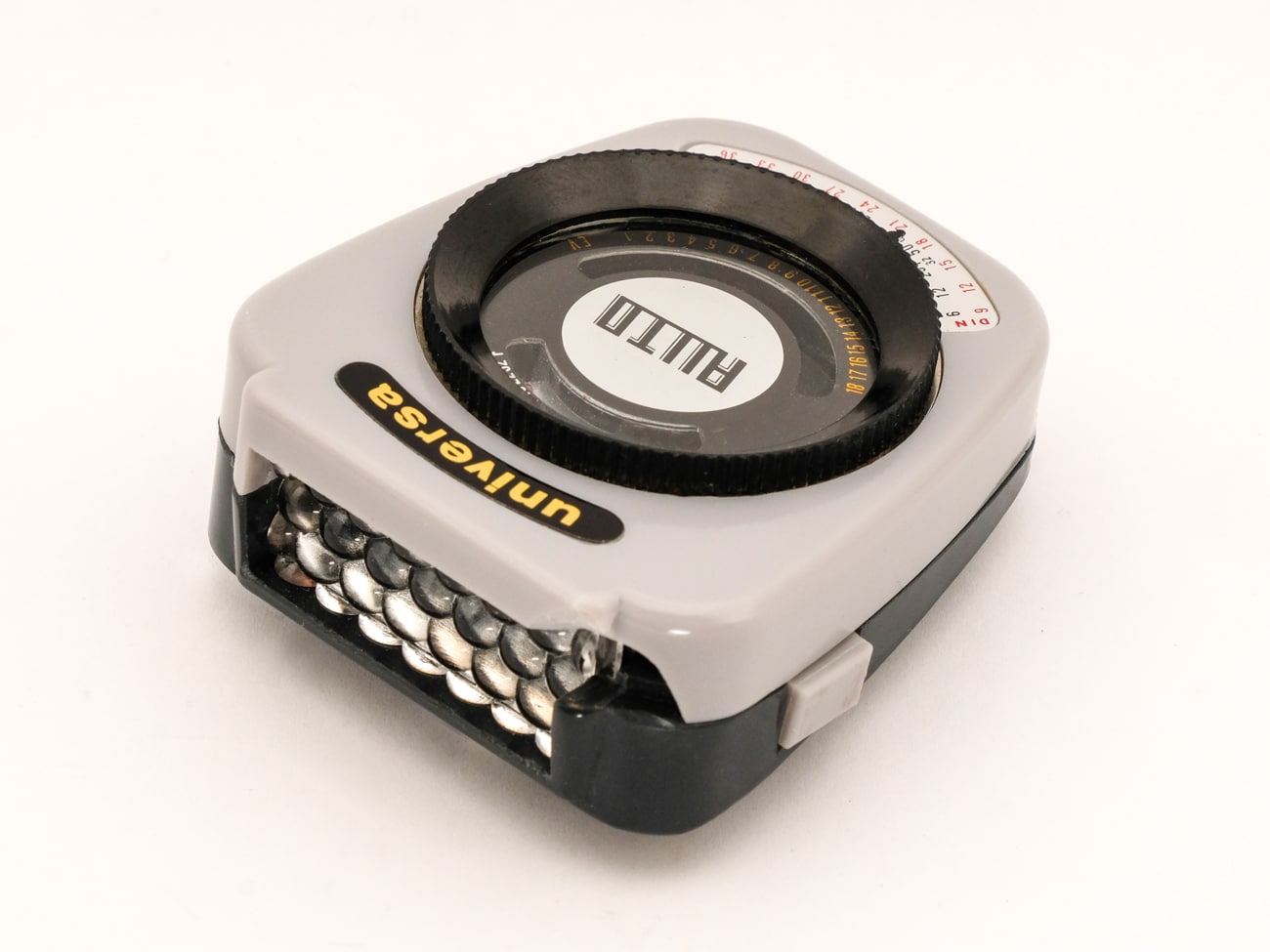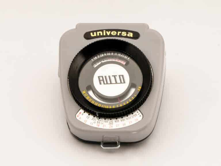 Belichtungsmesser mit Selen-Messzelle, vertrieben unter der Hamburger Handelsmarke Universa, produziert in Japan, 1960er Jahre. Interessant ist die Konstruktion des Zeigerinstruments: Gekoppelt mit dem Zeiger, der auf eine EV-Skala weist, dreht sich eine Scheibe mit Zeitskala, die einer Blendenskala gegenüber steht. Damit können die Belichtungswerte direkt abgelesen werden. Bei Einstellung der Empfindlichkeit mit dem schwarzen Stellring werden auch die EV-und die Blendenskala entsprechend justiert. Mit der seitlichen Taste lässt sich der Messwert arretieren. Die Selenzelle erzeugt eine der Helligkeit entsprechende elektrische Spannung, die zur Ansteuerung des Zeigerinstruments verwendet wird, eine zusätzliche Stromquelle ist nicht erforderlich. Die Skalenwerte: Zeiten von 1/2.000 Sekunde bis 30 Sekunden, Blenden 1,0-32, Empfindlichkeiten DIN 9-36/ASA 6-3200, Lichtwerte EV1-18.