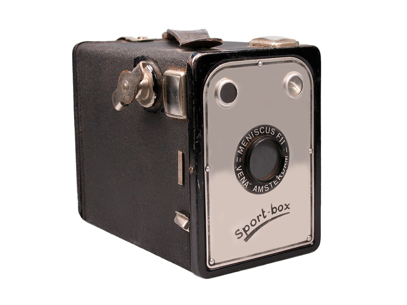 Seltene Box-Kamera im Art-déco-Stil von Vena (Optische en Fotografische Apparatenfabrik Vena N. V., Amsterdam), 1949. Rollfilm 120, Negativformat 6 x 9 cm, Objektiv: Vena Meniskus 1:11, Fixfokus. Einfachverschluss mit Momenteinstellung.