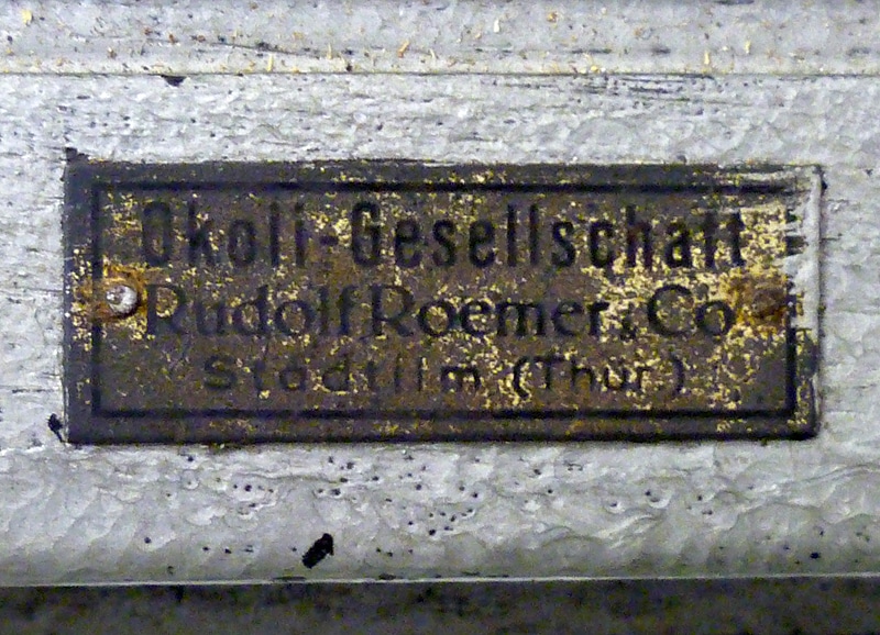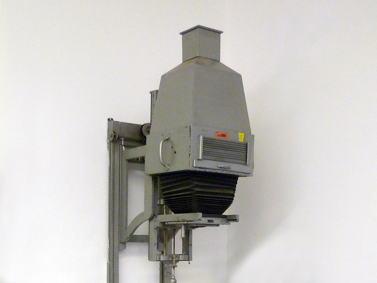 Okoli-Vergrößerer aus Holz für Negative 13 x 18 bis 24 x 24 cm. Etwa 2,20 Meter hoch, für Wandmontage. Hersteller: Okoli Gesellschaft Rudolf Roemer & Co., Stadtilm, Thüringen. Gebaut etwa in den Zwanziger Jahren.