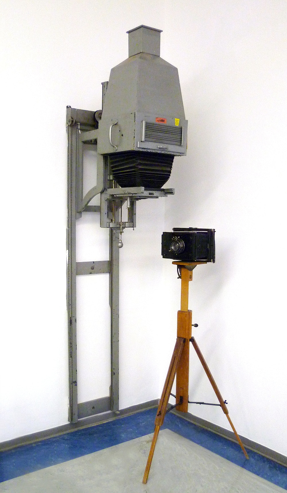 Der Okoli-Vergrößerer an einer Wand des Museums. Daneben steht zum Größenvergleich eine Contessa Nettel mit dem bereits stolzen Negativformat 13 x 18 cm auf einem Berlebach-Stativ.