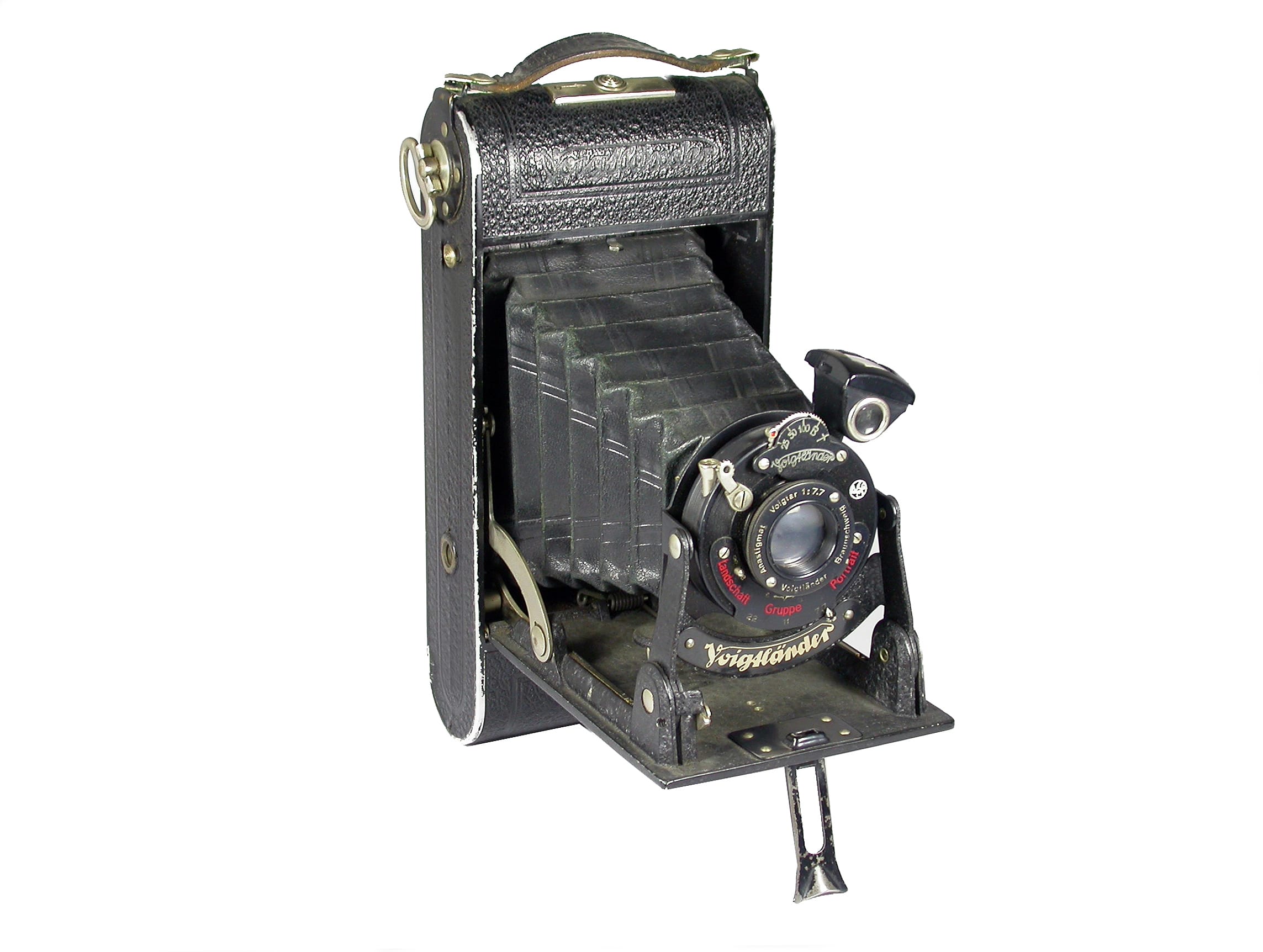 Klapp-/Spreizenkamera für den Rollfilm 120/620/B2 (Aufnahmeformat 6 x 9 cm), hergestellt in Braunschweig zwischen 1937 und 1942 in verschiedenen Variationen und Formaten. Hier mit Objektiv Voigtar 1:7,7/7,5 cm, Brillantsucher und Voigtländer-Zentralverschluss (von Alfred Gauthier, Calmbach).