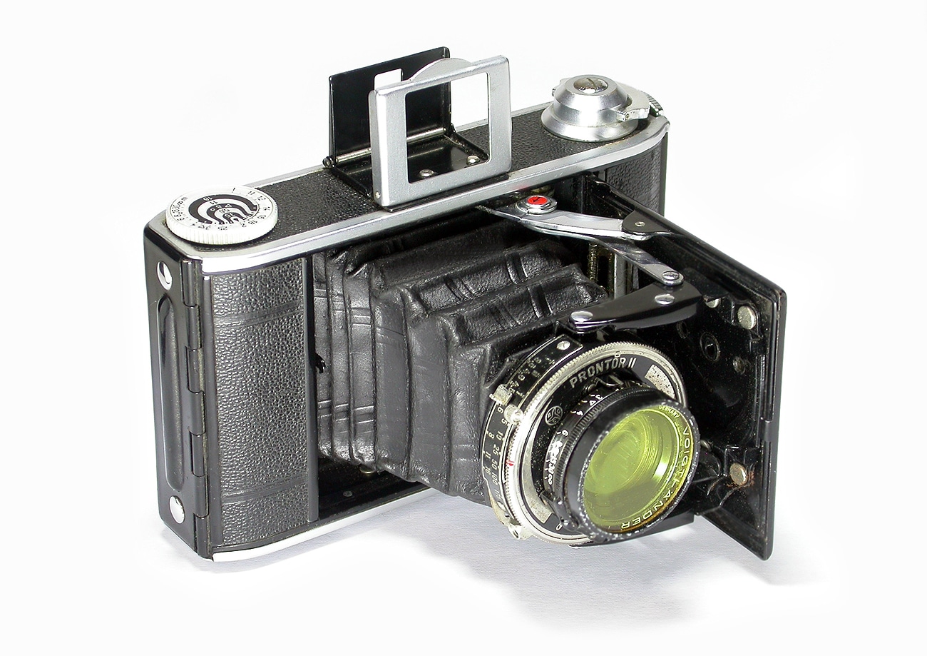 Klapp-/Spreizenkamera für den Rollfilm 120 (Negativformat 6 x 6 cm), Baujahr 1938, aus Braunschweig. Objektiv Voigtar 1:3,5/7,5 cm mit wegklappbarem Gelbfilter. Aufklappbarer Rahmensucher. Prontor-II-Verschluss bis 1/175 Sekunde.