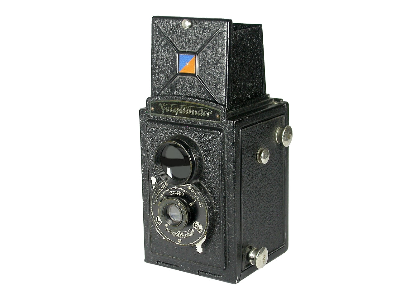 Sucherkamera aus Metall für den Rollfilm 120 (12 Aufnahmen im Negativformat 6 x 6 cm), etwa 1932. Die Kamera – hier mit dem Verschluss 1/25 bis 1/50 Sekunde und dem Voigtar 1:7,7/7,5 cm – wurde mit der bekannten Dreipunkt-Einstellung: „Landschaft – Gruppe – Porträt“ ausgeliefert. Drei Lochblenden (7,7, 11 und 22). Die Bildnummern werden durch ein selbsttätiges Zählwerk gut sichtbar eingestellt. Ein Filmfenster gibt es im Boden. Besonderheit des Museumsexemplars: Das Filmtransportrad wurde durch eine Metallklammer ersetzt.