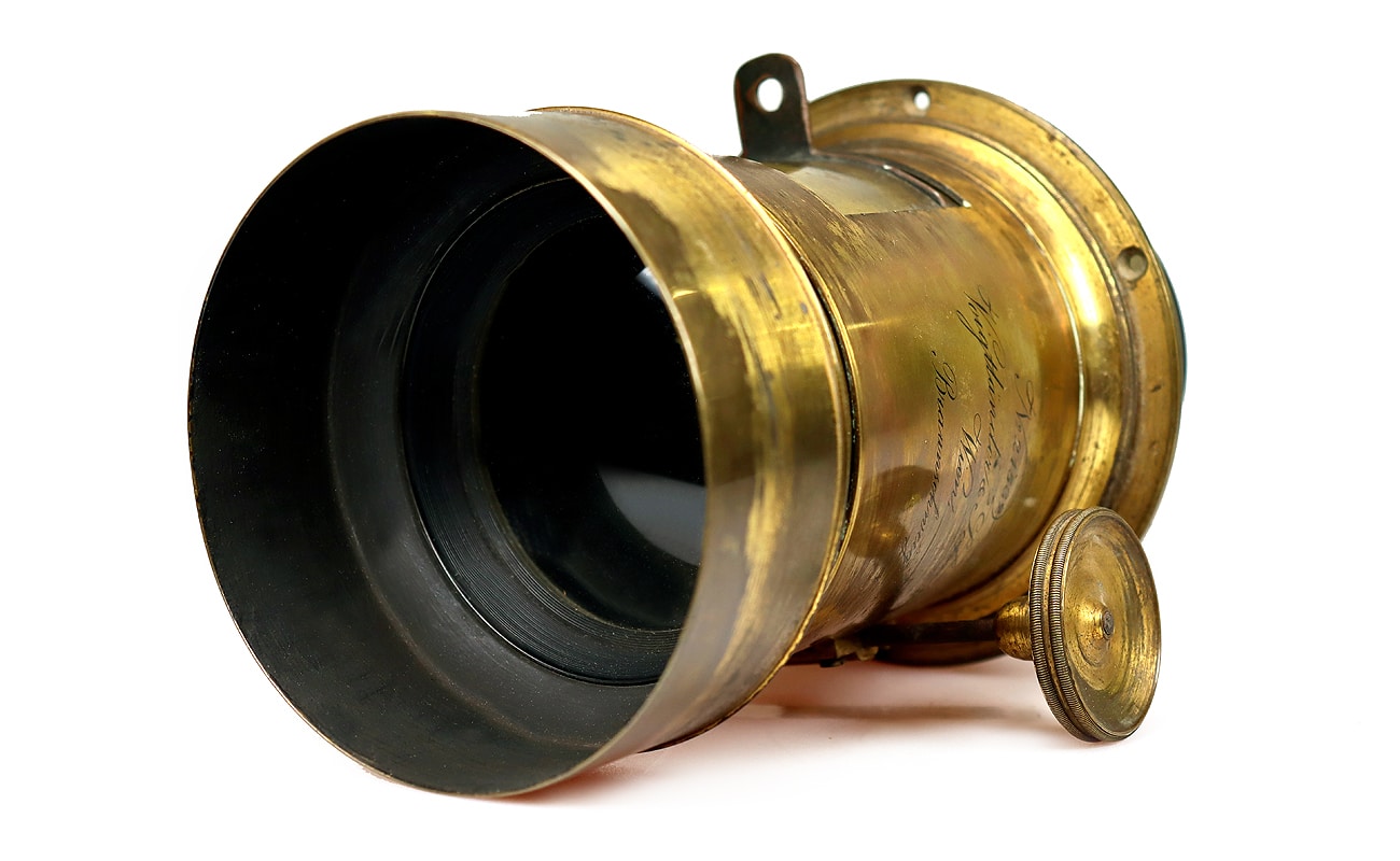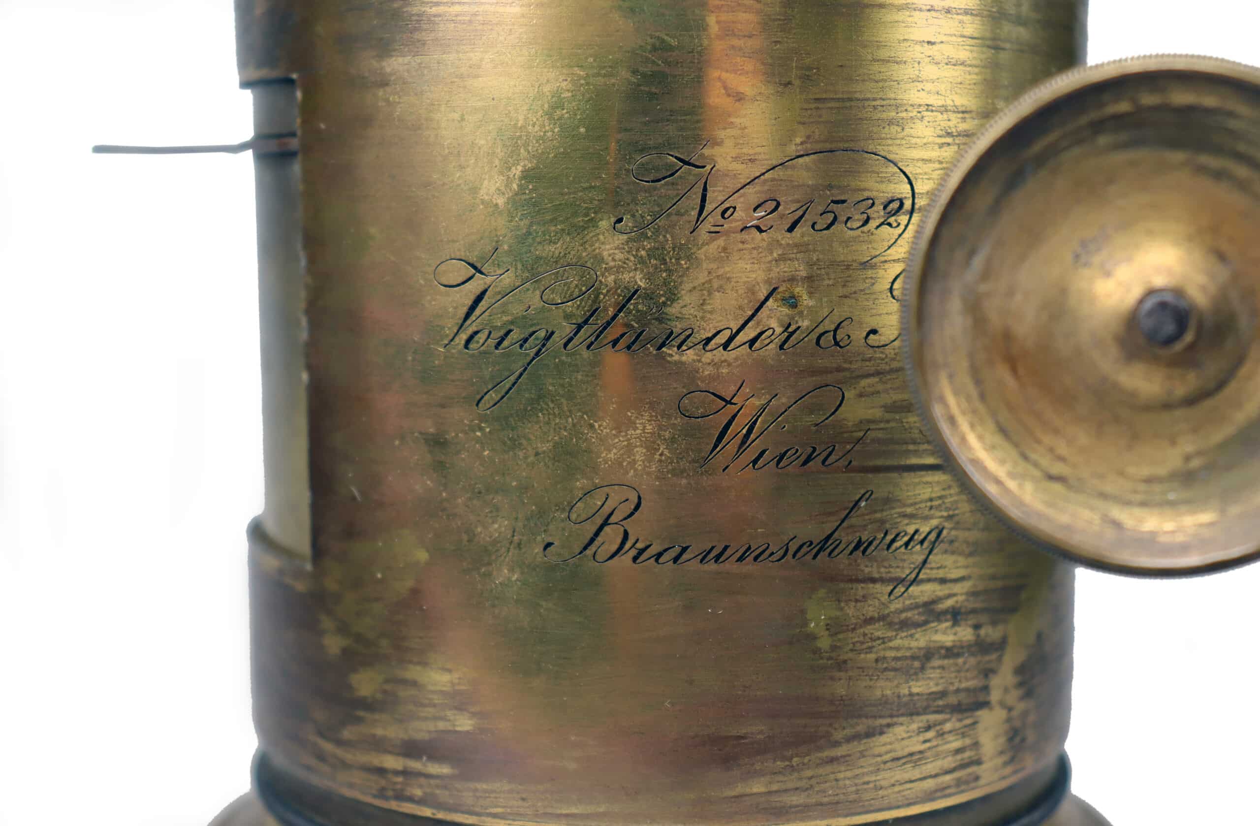 Messingobjektiv für antike Großformatkameras, vermutlich eines der Landschaftsobjekte namens „Orthoskop“. Scharfstellung über seitliches Rändelrad und Schneckengetriebe, Steckblenden. Hersteller: Voigtländer & Sohn, Wien und Braunschweig. Das scheint ein Original-Petzval-Objektiv zu sein. Wenn die frühen Voigtländer-Objektive einfach durchnummert wurden, dann schätzt der bekannte Voigtländer-Fachautor Claus Prochnow die Seriennummer 17832 um 1868 und 24248 auf 1880. Mit der Seriennummer 21532 dürfte dieses Objektiv also etwa von 1875 stammen.