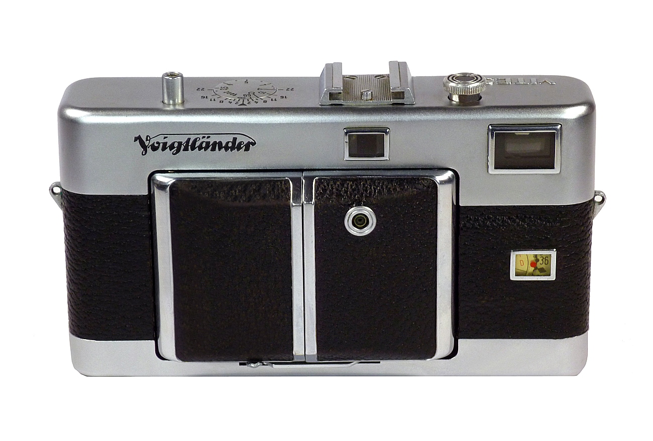 Messsucherkamera (1954-1955) für den Kleinbildfilm 135 (Aufnahmeformat 24 x 36 mm). Objektiv: das Voigtländer Color Skopar 1:3,5/50 mm oder – wie hier im Bild – der lichtstarke, farbkorrigierte Sechslinser Ultron 1:2,0/50 mm (Aufsteckfilter 34,5 mm). Mechanischer Zentralverschluss Synchro-Compur (schnellste Verschlusszeit 1/500 Sekunde), manuelle Belichtungssteuerung. Die Kamera hat jetzt gegenüber dem Urmodell (ab 1950) einen Zubehörschuh. Die beiden Modelle der Vitessa (Typ 125) wurden zusammen in einer Stückzahl von ca. 145.000 hergestellt. Diese Kamera hat eine außergewöhnliche Konstruktion: In dem flachen Kamerakörper öffnet sich durch Druck auf den Auslöser (links oben) die Vorderwand wie eine Bühne, aus der das Objektiv in die starre Aufnahmestellung heraus schwingt. Gleichzeitig springt die sogenannte Combi-Taste, ein relativ langer Stift, aus dem Kamera-Oberteil (oben rechts). Beim Niederdrücken dieser Taste wird unter gleichzeitigem Aufheben der Doppelbelichtungssperre der Verschluss gespannt und der Film um eine Formatbreite weitertransportiert, wobei auch noch die Federung der Film-Andruckplatte aufgehoben wird, um beim schnellen Weiterschalten mechanische Verletzungen durch Druck oder Scheuern zu vermeiden.