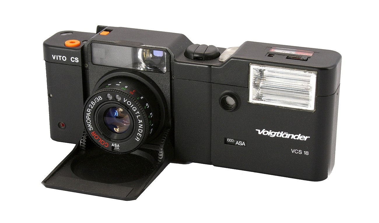 Wunderschöne Sucherkamera ähnlich der Minox 35, 1983 bis 1988 hergestellt von Balda, für den Kleinbildfilm 135 (Negativformat 24 x 36 mm). Objektiv: Voigtländer Color-Skopar 1:2,8/38 mm (4-Linser). Entfernungseinstellung von 0,9 m bis unendlich. Objektiv versenkbar und durch die Kameraklappe geschützt. Sucher: Leuchtrahmensucher mit Einspiegelung der Entfernungssymbole und Warnanzeige bei Unterbelichtungsgefahr. Verschluss: Elektronischer Zentralverschluss 1 bis 1/500 Sekunde. Belichtungsmessung: 2 CdS-Zellen mit Programmautomatik. Transport: Schnellschalthebel mit Verschlussaufzug und Filmtransport. Batterie: 2 Knopfzellen 1,5 V. Hier mit angesetztem Systemblitz VCS 18 (Computerblitz mit Leitzahl 18).