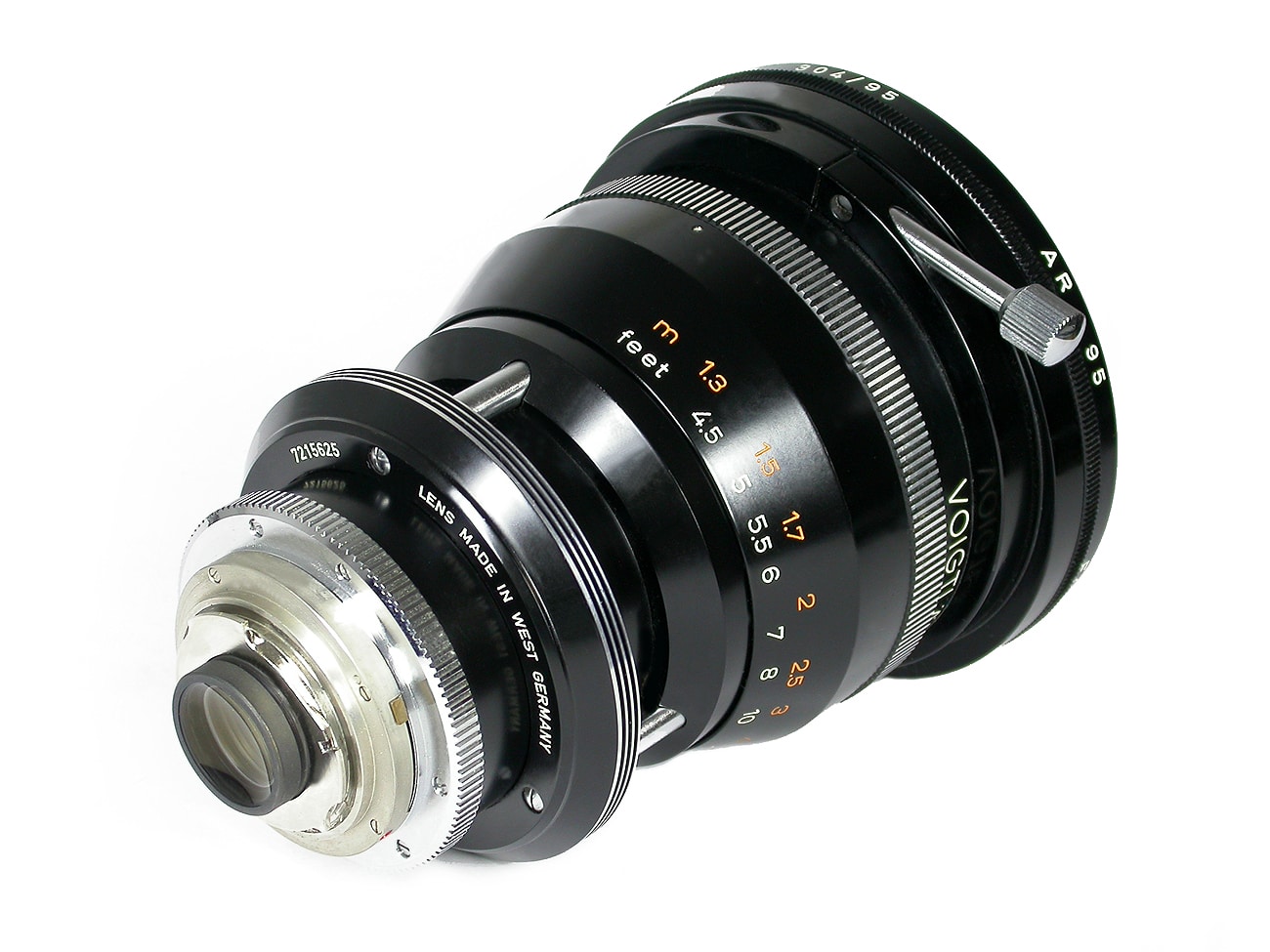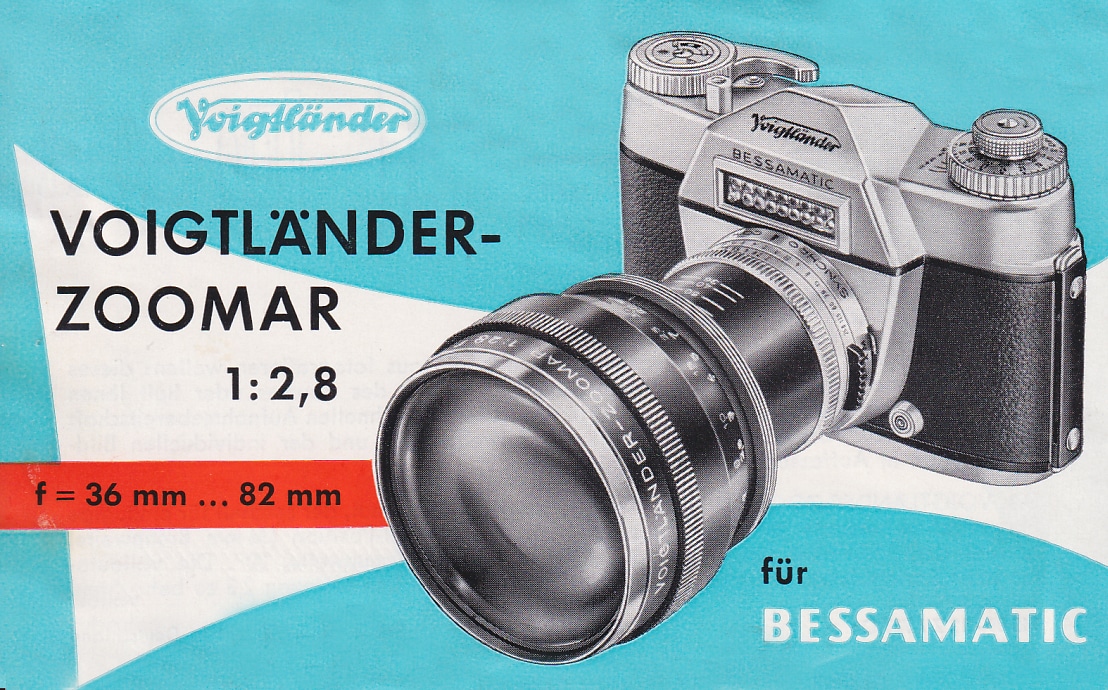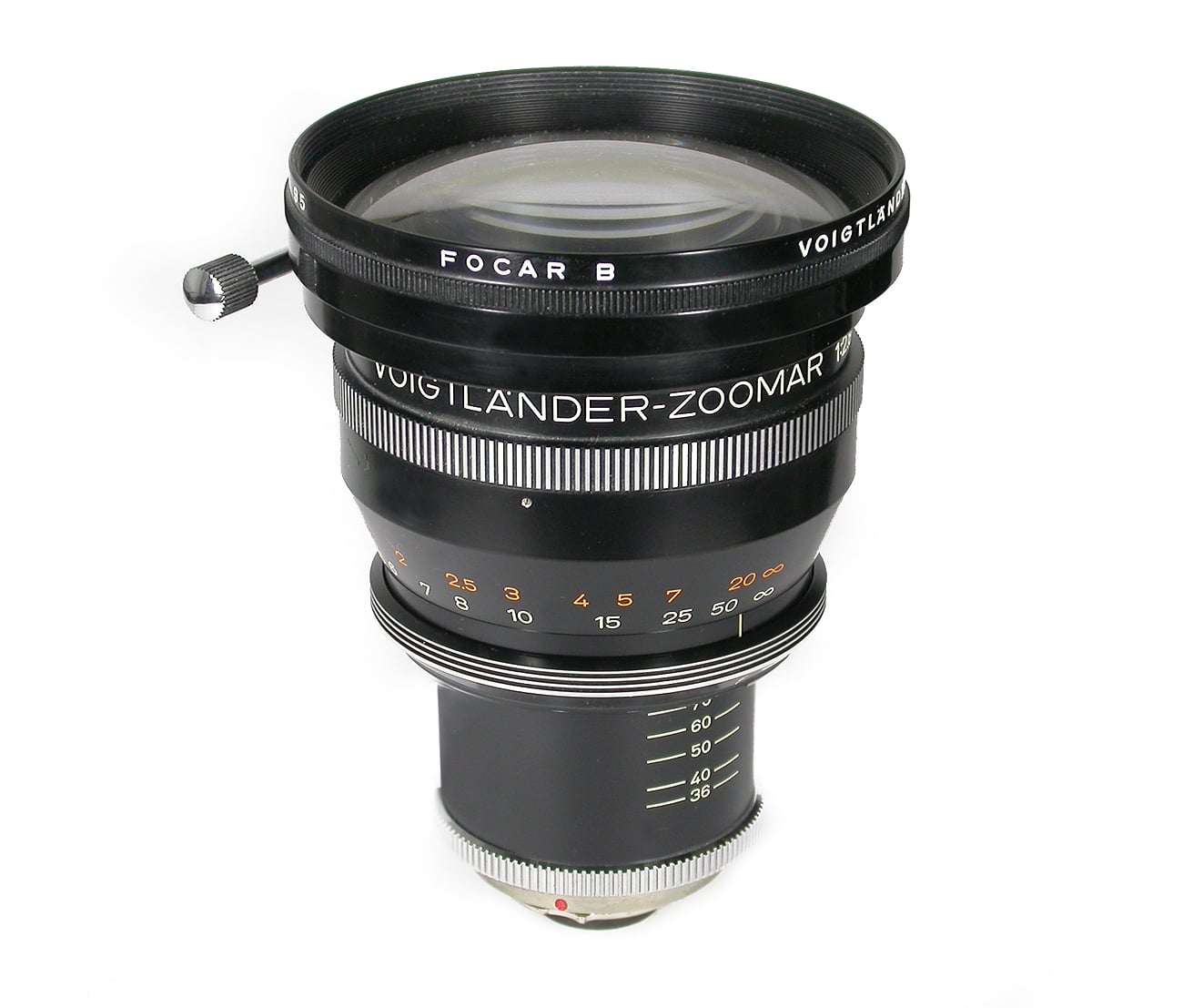 Das erste Zoom-Objektiv der Welt für eine Kleinbildkamera, das Voigtländer Zoomar 1:2,8/36-82 mm (hier mit Vorsatzlinse Voigtländer Focar B), kam 1962 auf den Markt und passte zum Spezialbajonett der Voigtländer-Zentralverschlusskameras Bessamatic und Ultramatic. Es gab aber auch Objektive mit anderen Kameraanschlüssen wie etwa für die Exakta. Konstrukteur war übrigens kein Geringerer als Heinz Kilfitt.