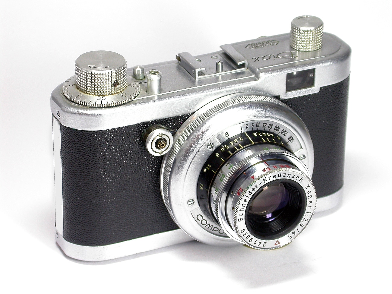 Deutsche Kleinbildsucherkamera von Walter Voss, Ulm/Donau, 1950 bis 1951, für den Kleinbildfilm 135 (Aufnahmeformat 24 x 36 mm). Manuelle Scharfeinstellung, mechanischer Zentralverschluss bis 1/500 Sekunde, manuelle Belichtungssteuerung, Objektiv: Schneider-Kreuznach Xenar 1:2,8/45 mm (im Bild/Seriennummer: 2419930) oder Heligon 1:2,0/45 mm oder Xenon 1:2,0/45 mm, Aufsteckfilter 32 mm. Das Modell I von 1951 ist erkennbar am gestuften Oberteil mit dem großen Sucherfenster. Der Verschluss war zuerst ein Compur-Rapid (wie im Bild), dann ein Synchro-Compur. Zunächst (1950) gab es dieses Modell nur mit Xenar, ab 1951 wahlweise auch mit Xenon/Heligon. Das Museums-Exemplar wurde also 1950 gebaut.
